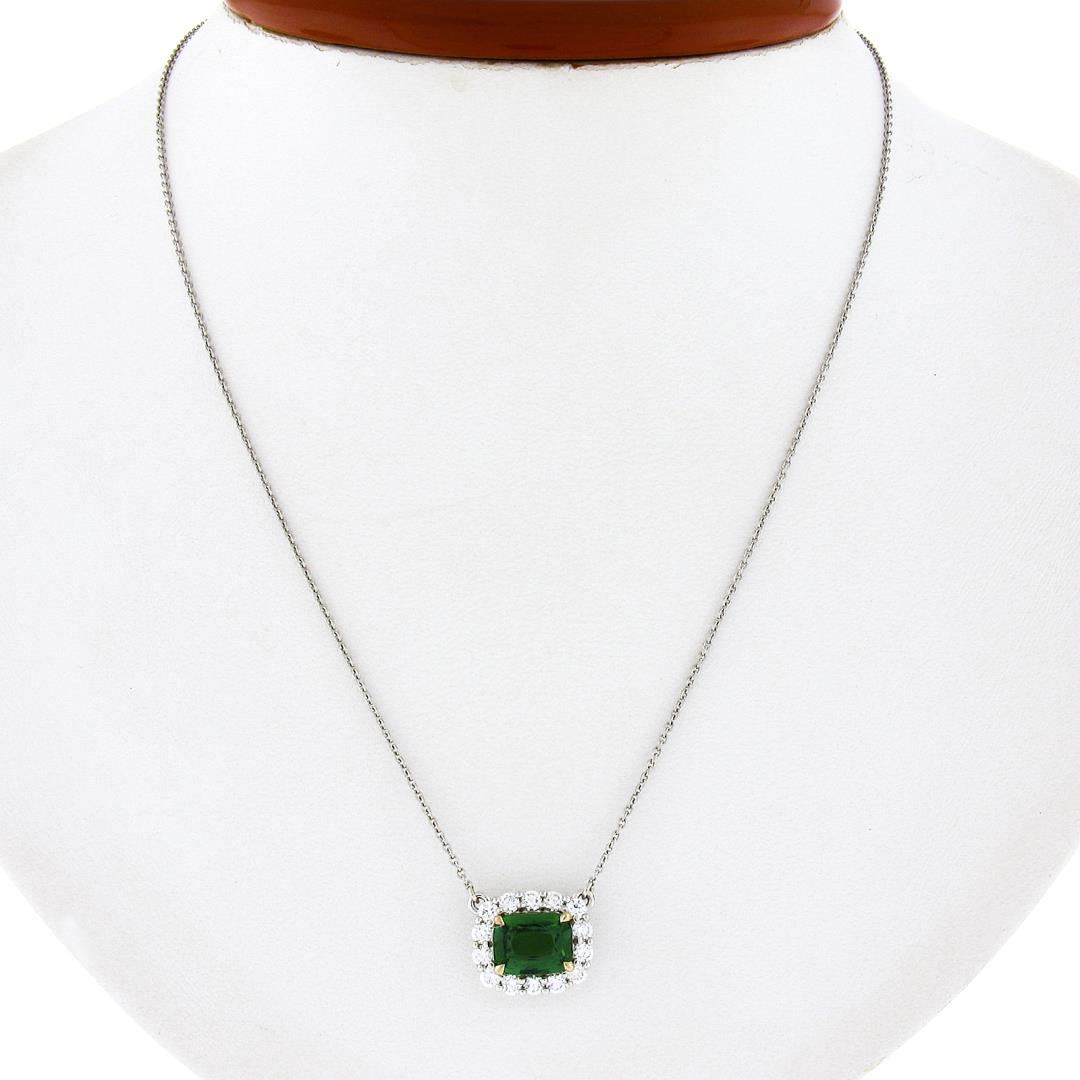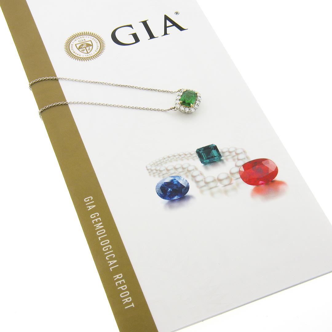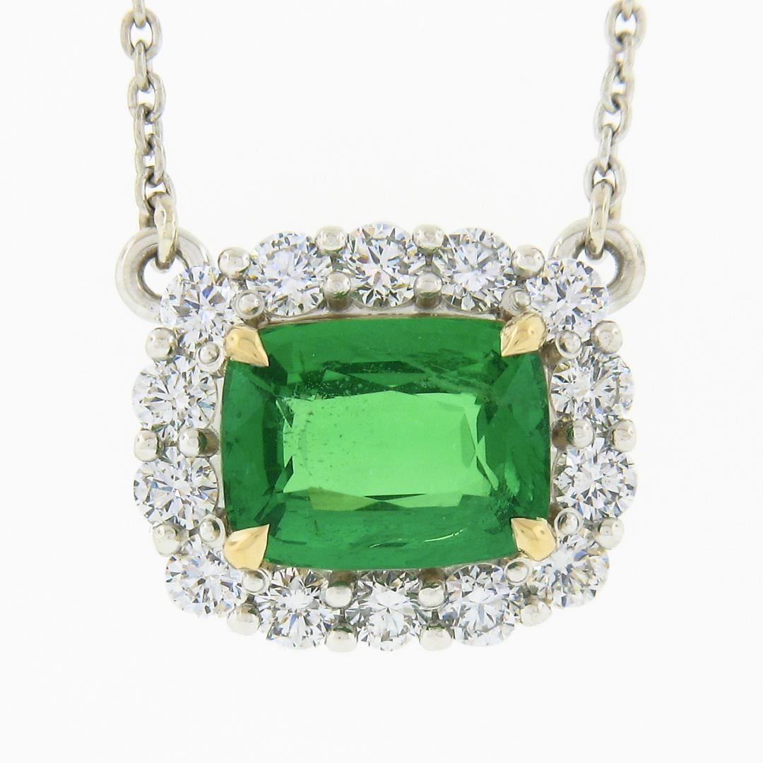 A new solid platinum & 18k yellow gold pendant necklace, with 1 GIA graded cushion cut natural tsavorite ( 2.04ct), surrounded with a halo of 14 round brilliant cut natural diamonds (G/H - VS1/VS2 ; 0.60ctw). 18.5 inch cable link chain, 5.79 grams total weight, pendant measures 11x13mm. Comes with all original relevant certifications.