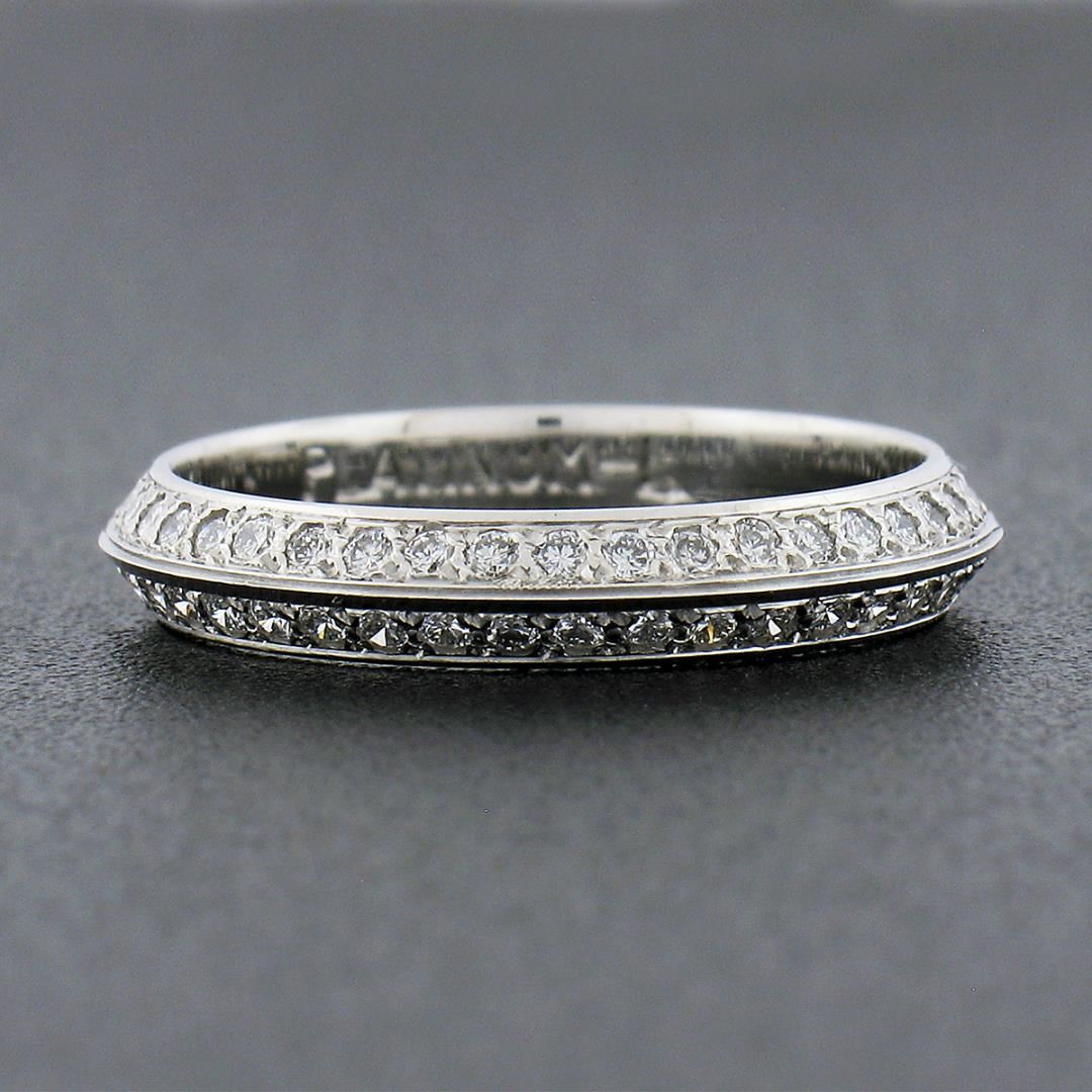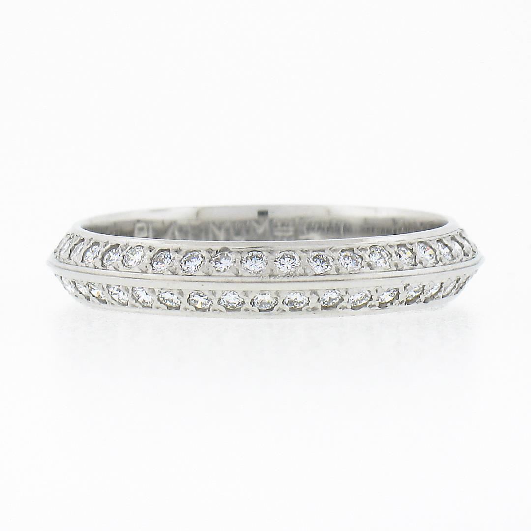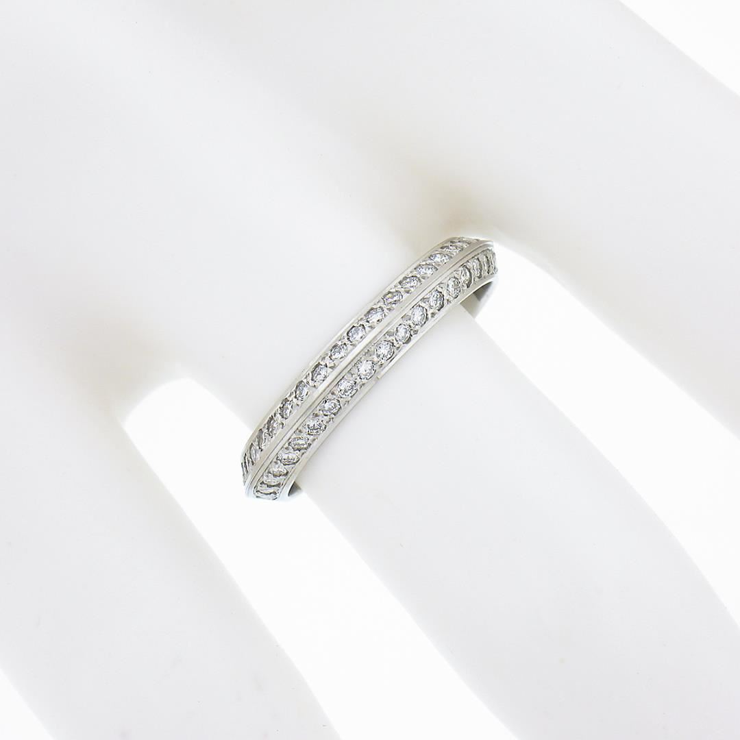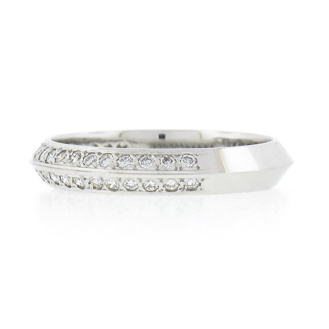 A new solid platinum band ring, with 40 round cut natural diamonds (G/H - VS1/VS2 ; 0.30ctw). The ring is size 6.5, weighs a total of 3.3 grams, and measures 3.4mm wide.