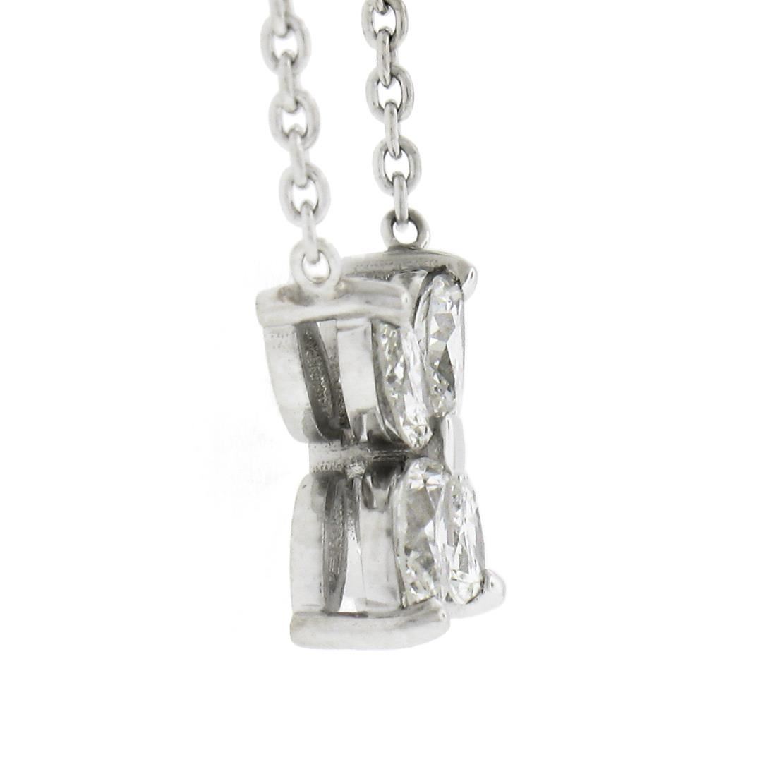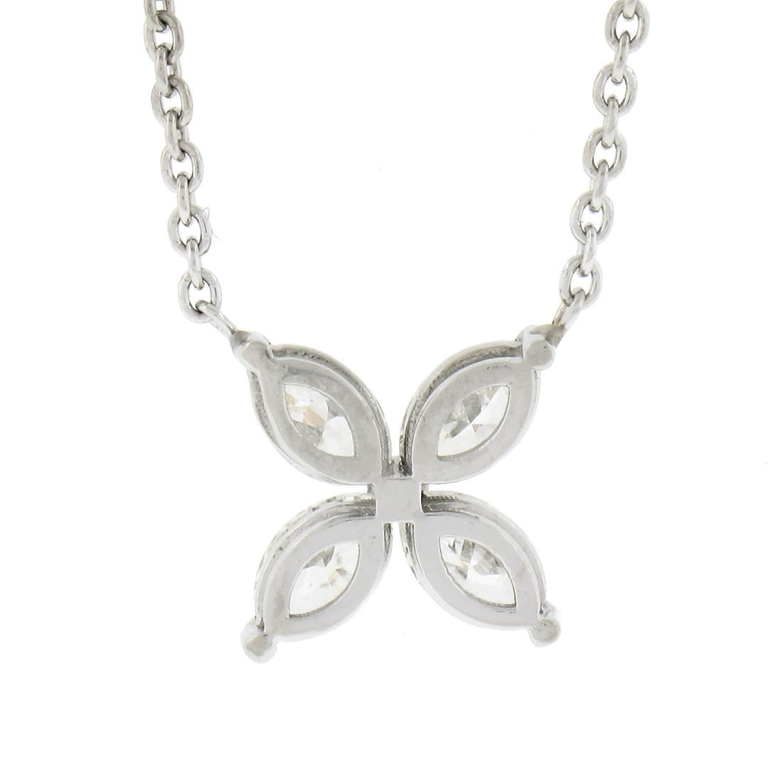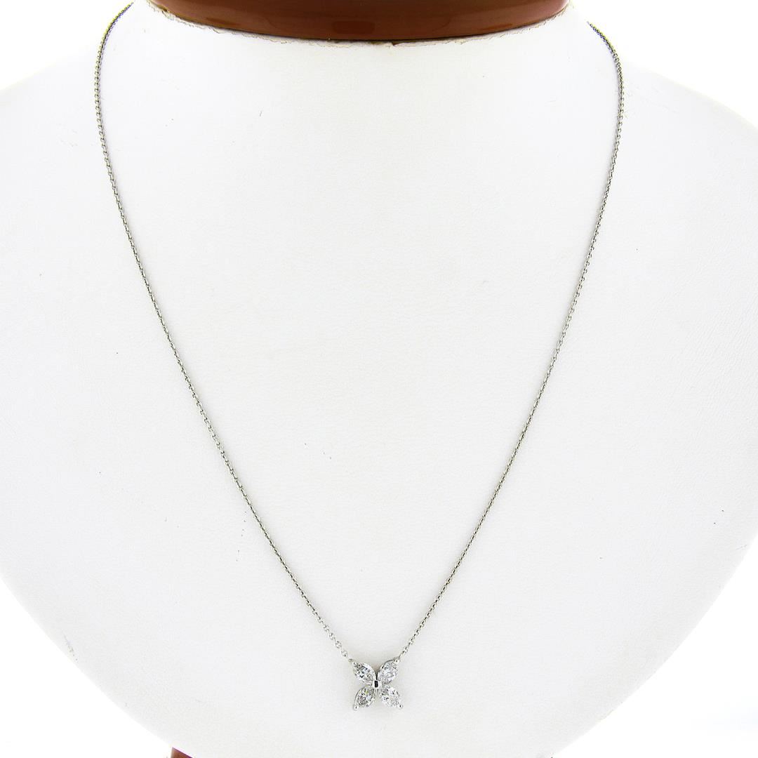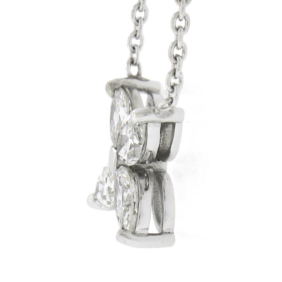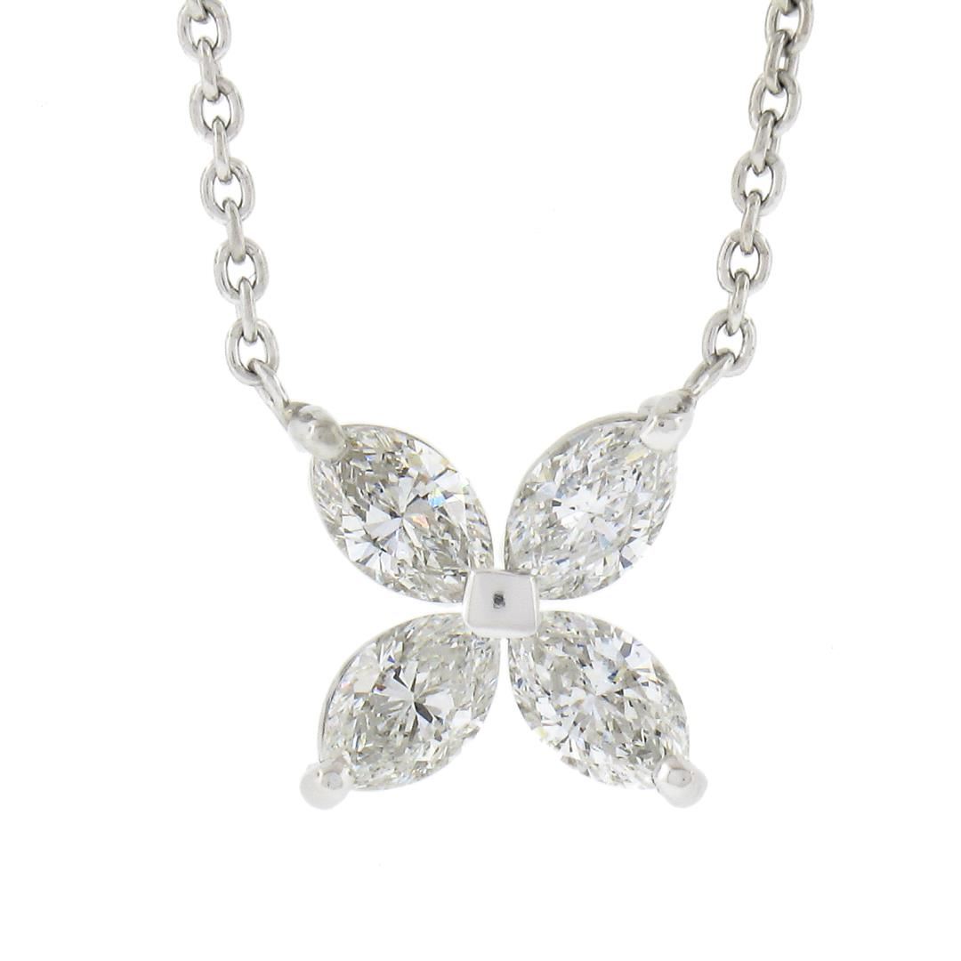 A new solid platinum pendant necklace, with 4 marquise cut natural diamonds (G - VS1/VS2 ; 0.56ctw). Adjustable 16.5 & 18.5 inch cable link chain, 3.97 grams total weight, pendant measures 8.2x8.2mm.