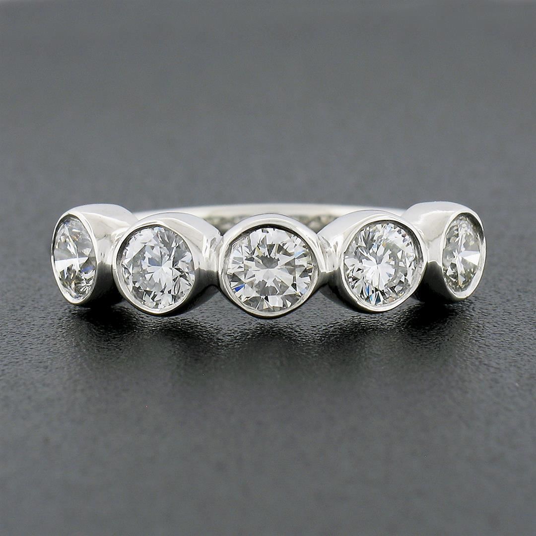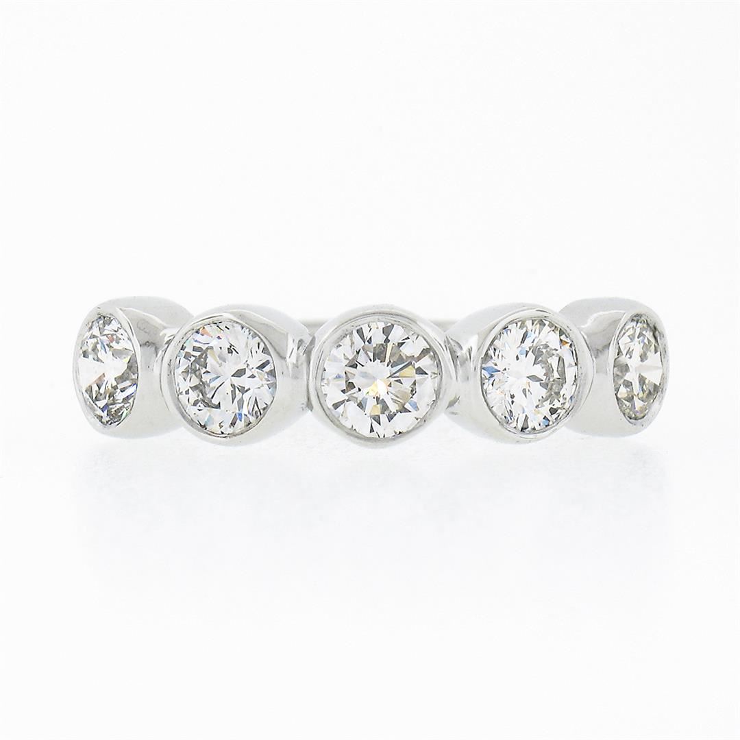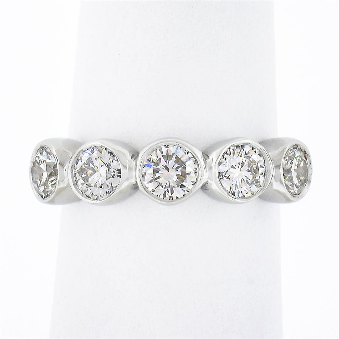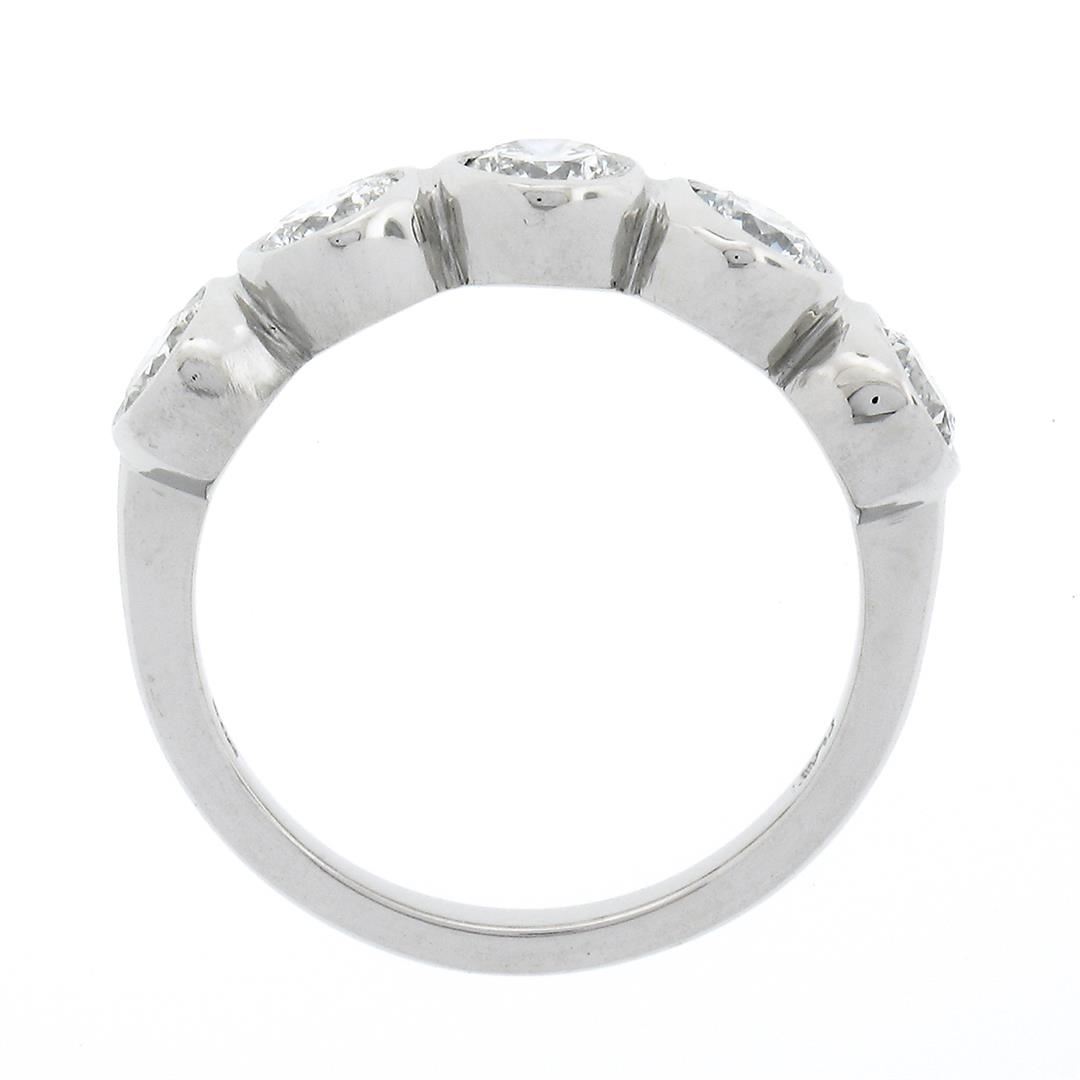 A new solid platinum band ring, with 5 round brilliant cut natural diamonds (G/H - VS1/VS2 ; 1.36ctw). The ring is size 6.5, weighs a total of 5.46 grams, and measures 5.10mm wide.