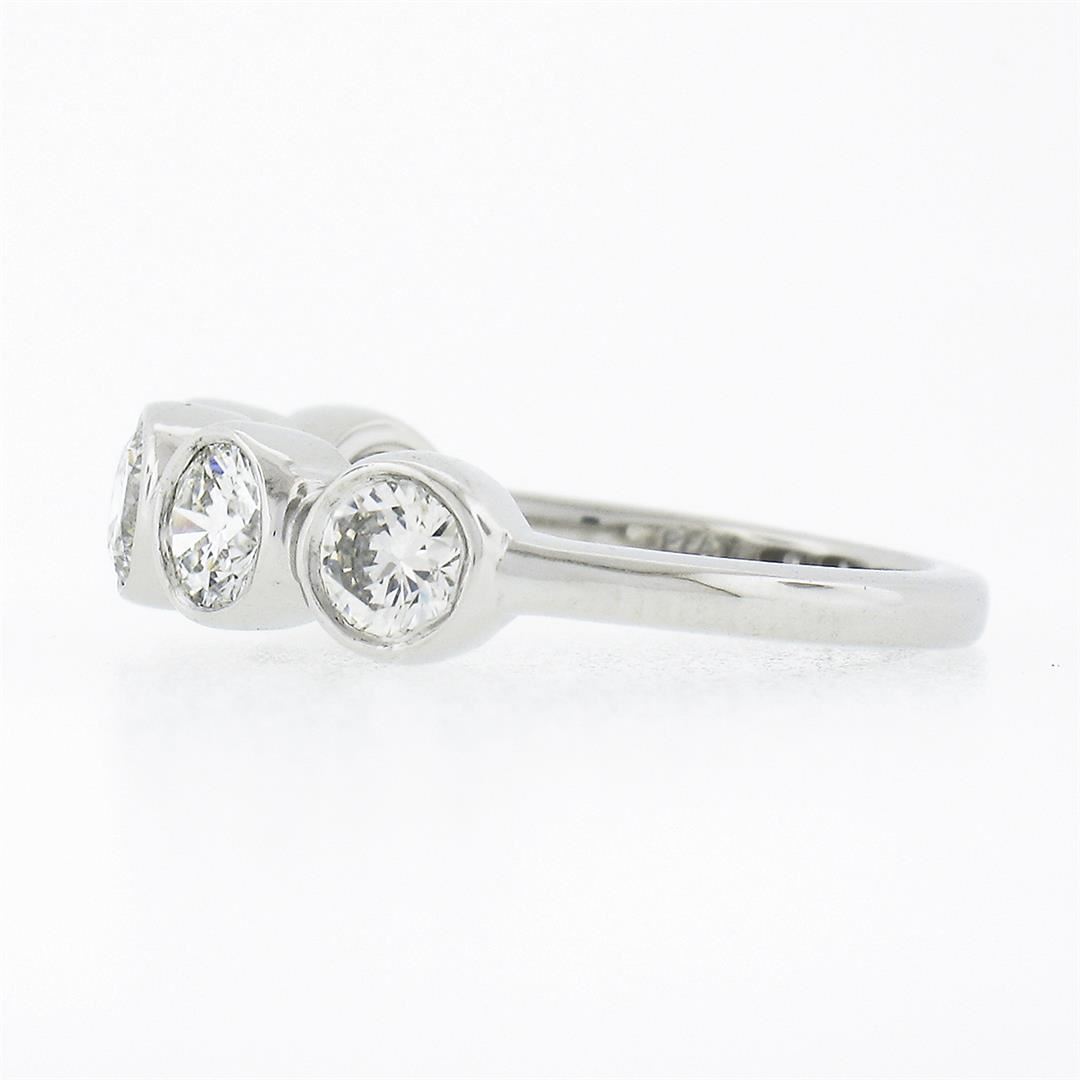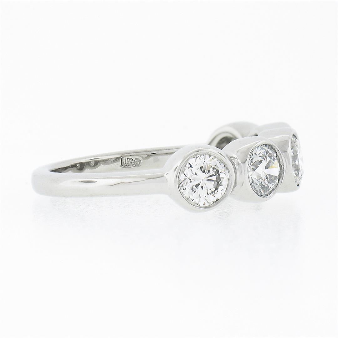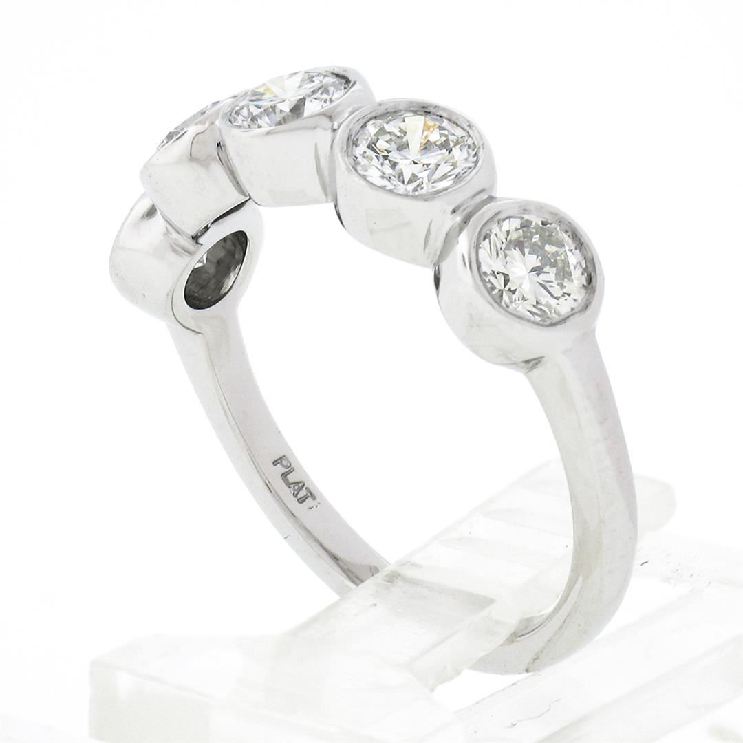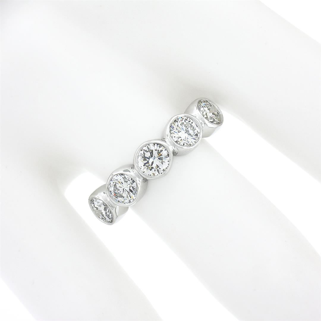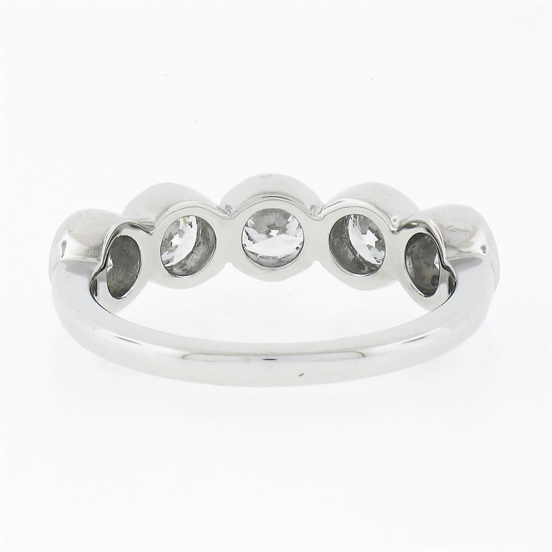 A new solid platinum band ring, with 5 round brilliant cut natural diamonds (G/H - VS1/VS2 ; 1.36ctw). The ring is size 6.5, weighs a total of 5.46 grams, and measures 5.10mm wide.