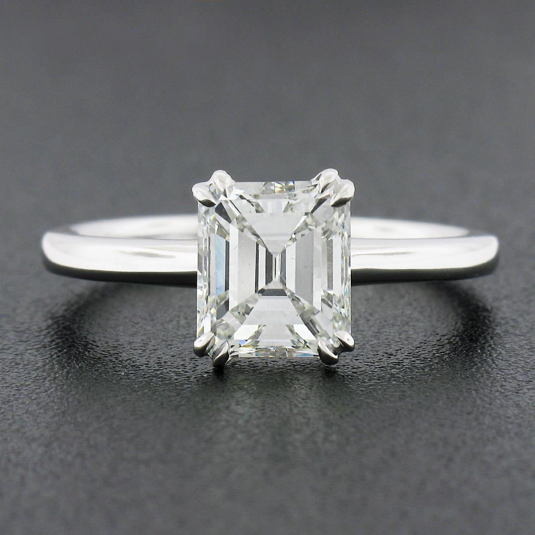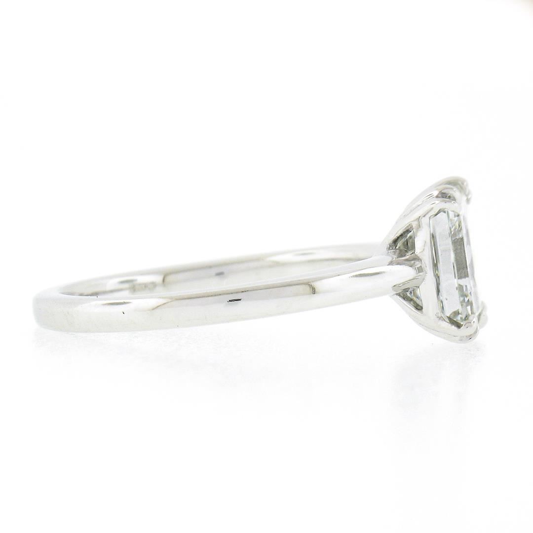 A new platinum engagement ring, with 1 GIA graded emerald cut natural diamonds (F - VS2 ; 1.88ct ). The ring is size 7.0, weighs a total of 4.95 grams, and measures 8.5mm wide. Comes with all original relevant certifications.