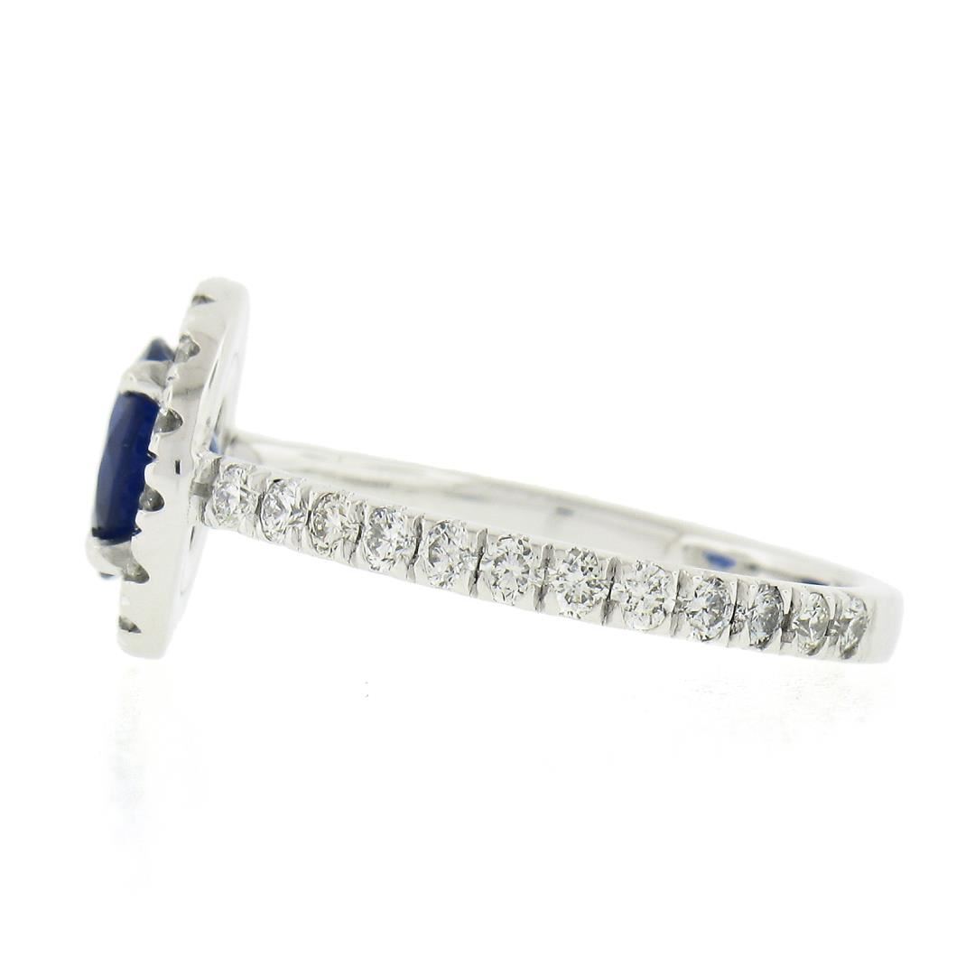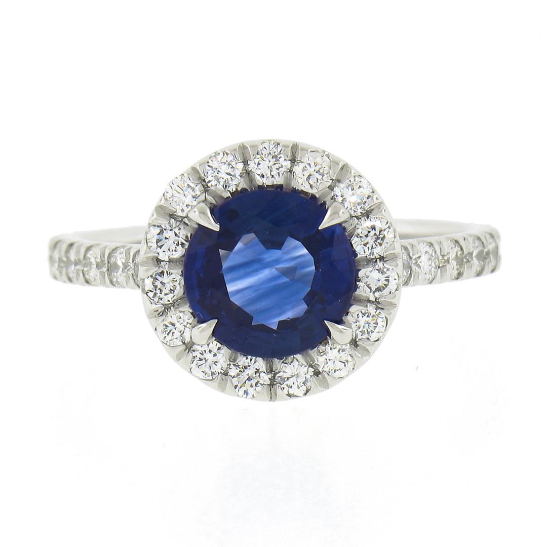 A new solid platinum ring, with 1 GIA graded round cut natural sapphire (1.41ct ), and a halo of 39 round cut natural diamonds (G/H - VS1/VS2 ; 0.80ctw). The ring is size 6.5, weighs a total of 4.19 grams, and measures 11.1mm wide. Comes with all original relevant certifications.