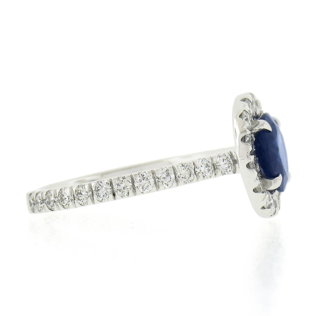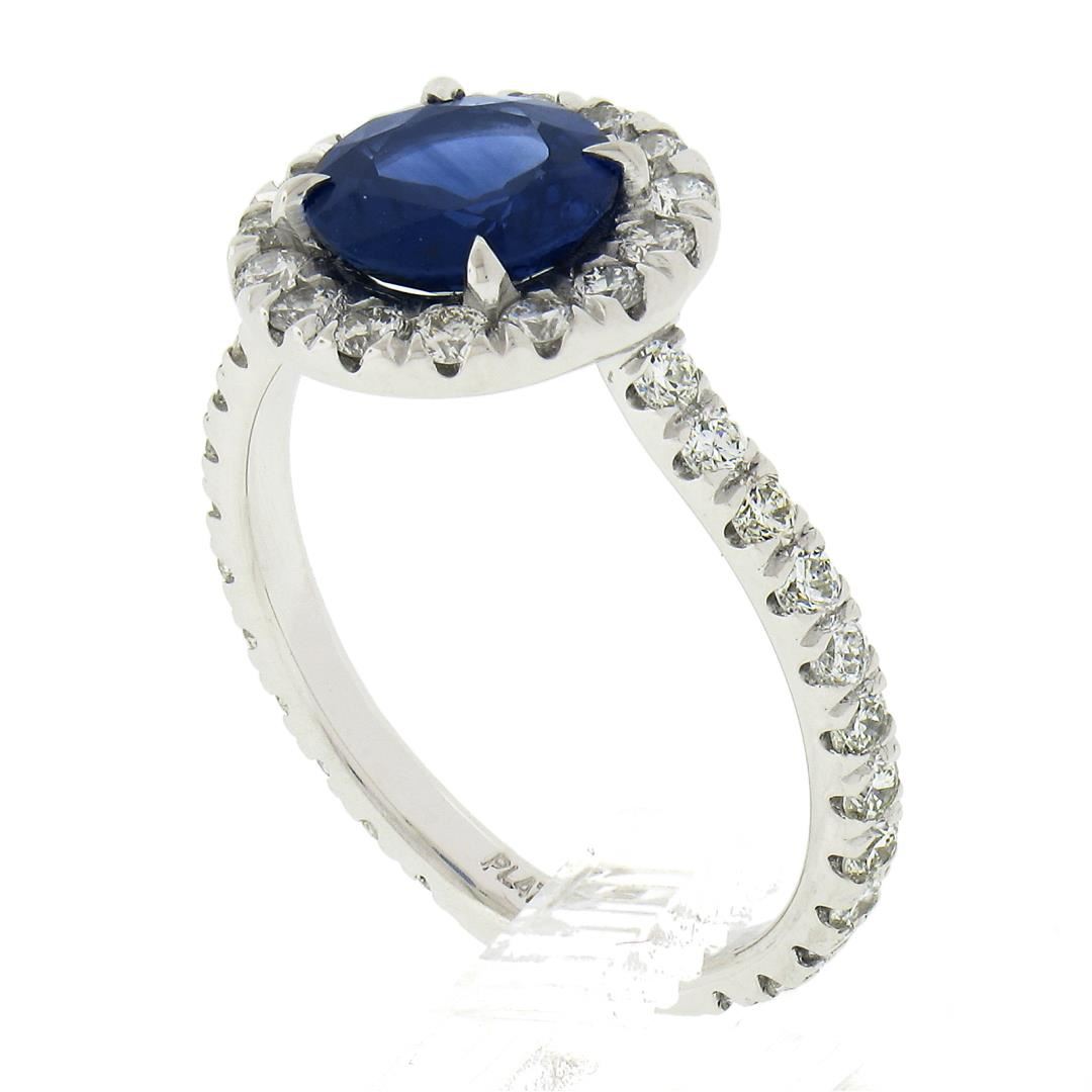 A new solid platinum ring, with 1 GIA graded round cut natural sapphire (1.41ct ), and a halo of 39 round cut natural diamonds (G/H - VS1/VS2 ; 0.80ctw). The ring is size 6.5, weighs a total of 4.19 grams, and measures 11.1mm wide. Comes with all original relevant certifications.