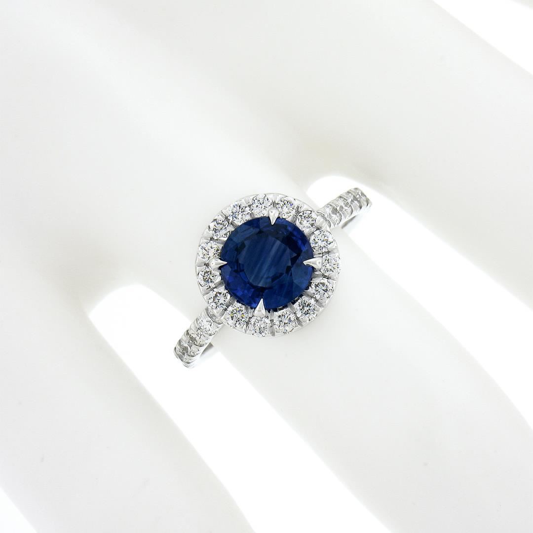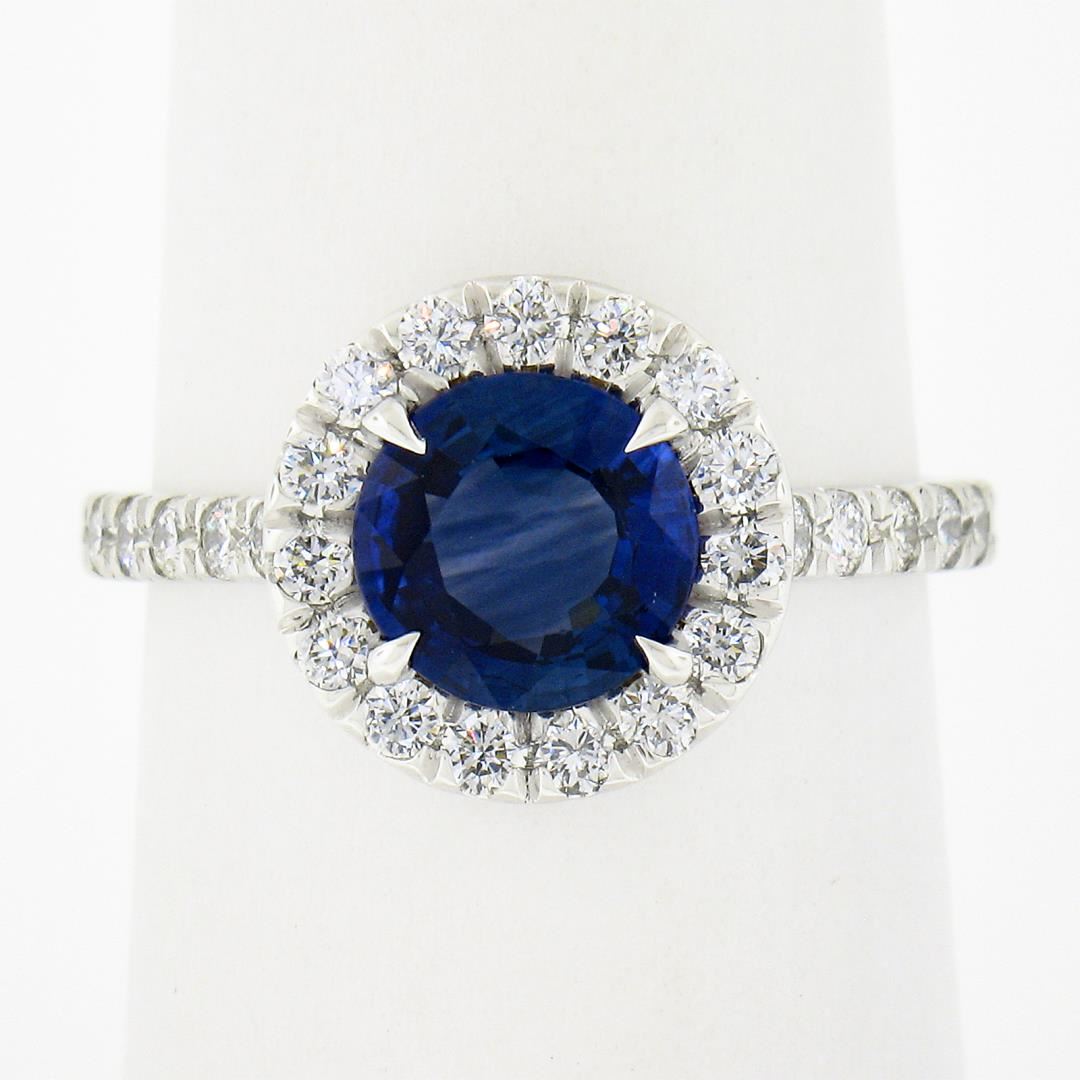 A new solid platinum ring, with 1 GIA graded round cut natural sapphire (1.41ct ), and a halo of 39 round cut natural diamonds (G/H - VS1/VS2 ; 0.80ctw). The ring is size 6.5, weighs a total of 4.19 grams, and measures 11.1mm wide. Comes with all original relevant certifications.