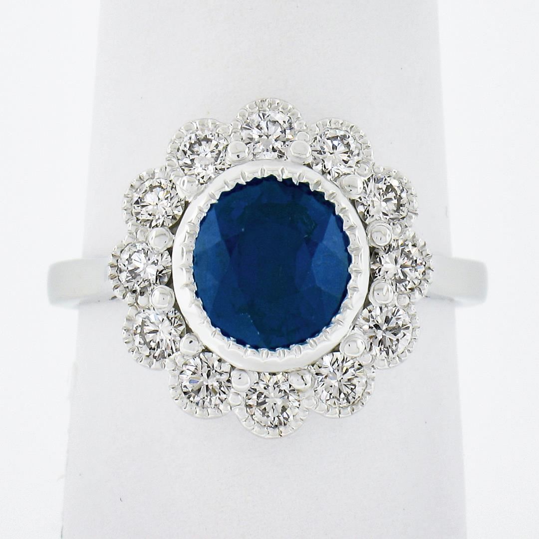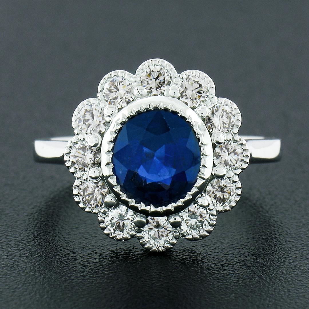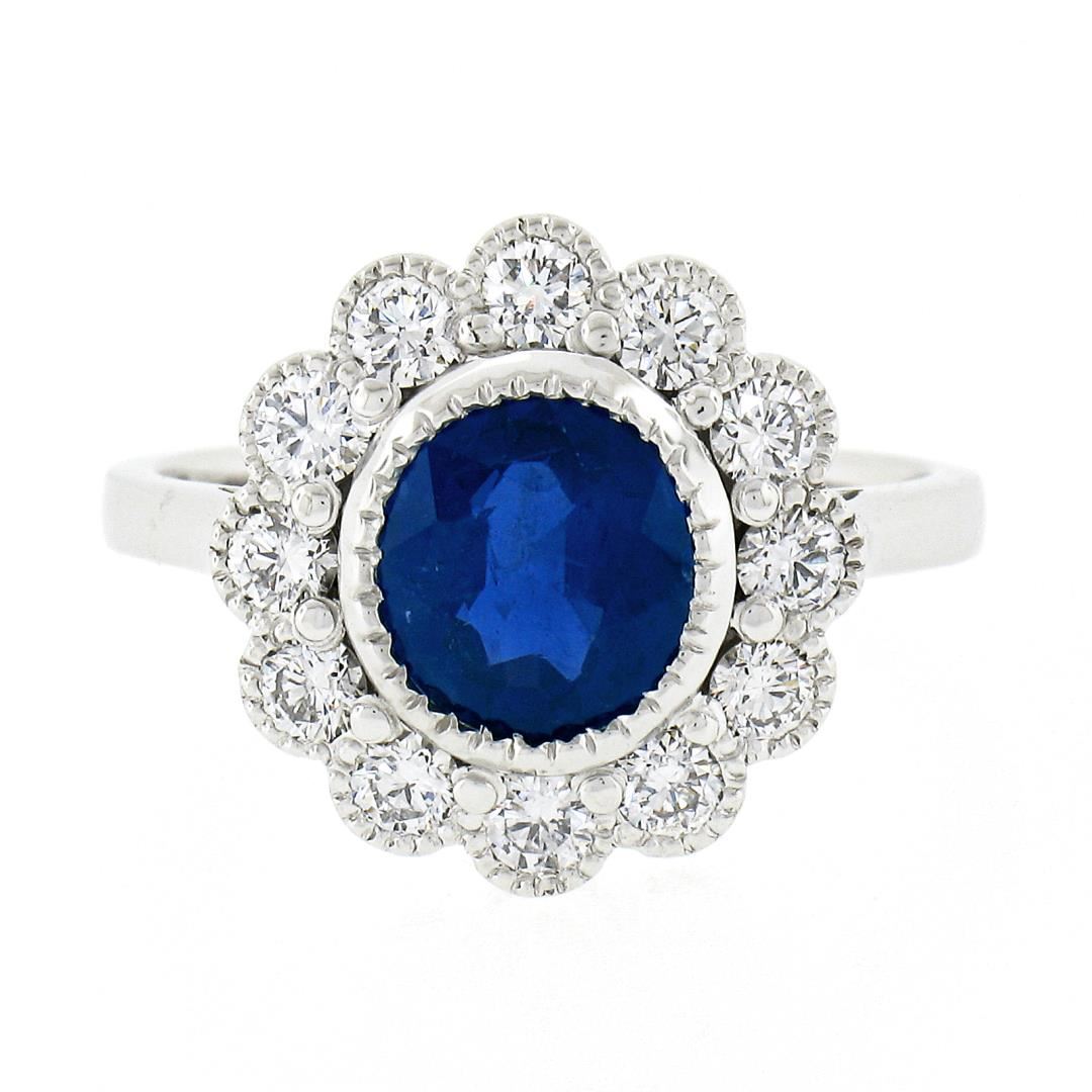 A new solid platinum ring, with 1 GIA graded oval cut natural sapphire (1.58ct), and a halo of 12 round brilliant cut natural diamonds (F/G - VS1/VS2 ;' 0.79). The ring is size 6.5, weighs a total of 7.89 grams, and measures 14.70mm wide. Comes with all original relevant certifications.