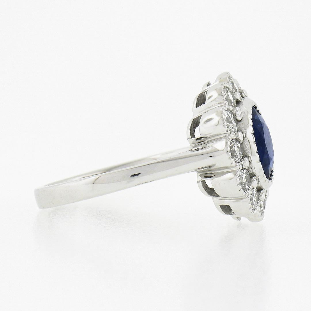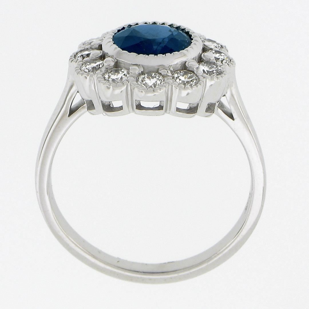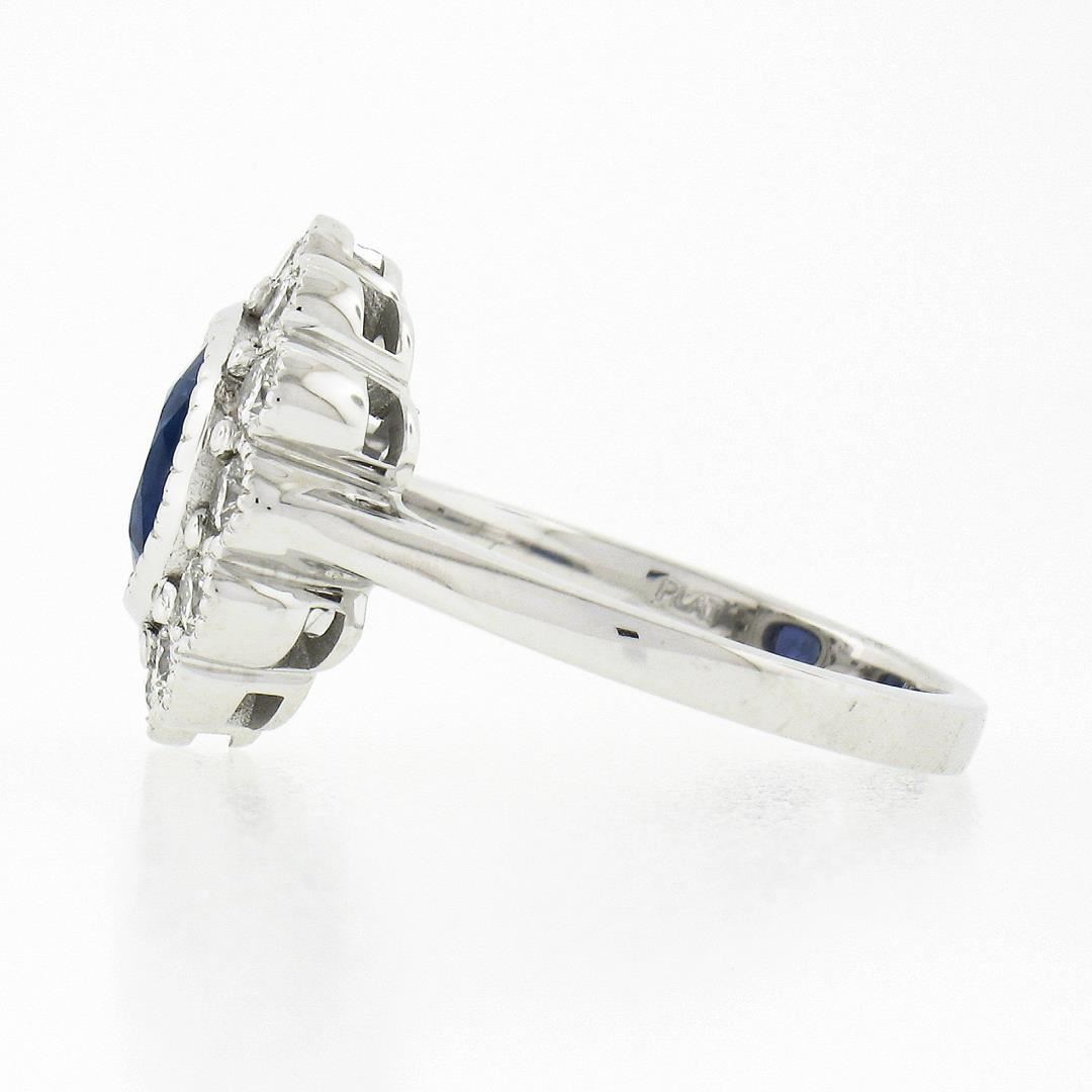 A new solid platinum ring, with 1 GIA graded oval cut natural sapphire (1.58ct), and a halo of 12 round brilliant cut natural diamonds (F/G - VS1/VS2 ;' 0.79). The ring is size 6.5, weighs a total of 7.89 grams, and measures 14.70mm wide. Comes with all original relevant certifications.