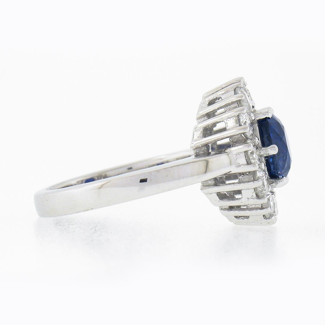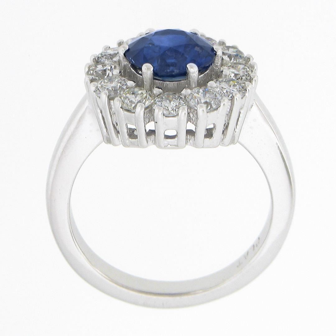 A new solid platinum ring, with 1 GIA graded round cut natural sapphire (1.96ct), surrounded with a halo of 12 round brilliant cut natural diamonds (G/H - VS2/SI1 ; 1.10ctw). The ring is size 6.0, weighs a total of 9.51 grams, and measures 14.6mm wide. Comes with all original relevant certifications.