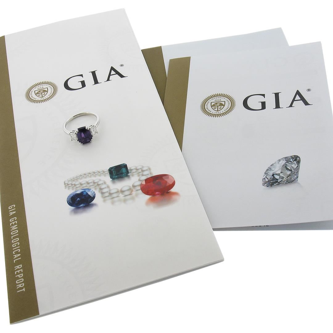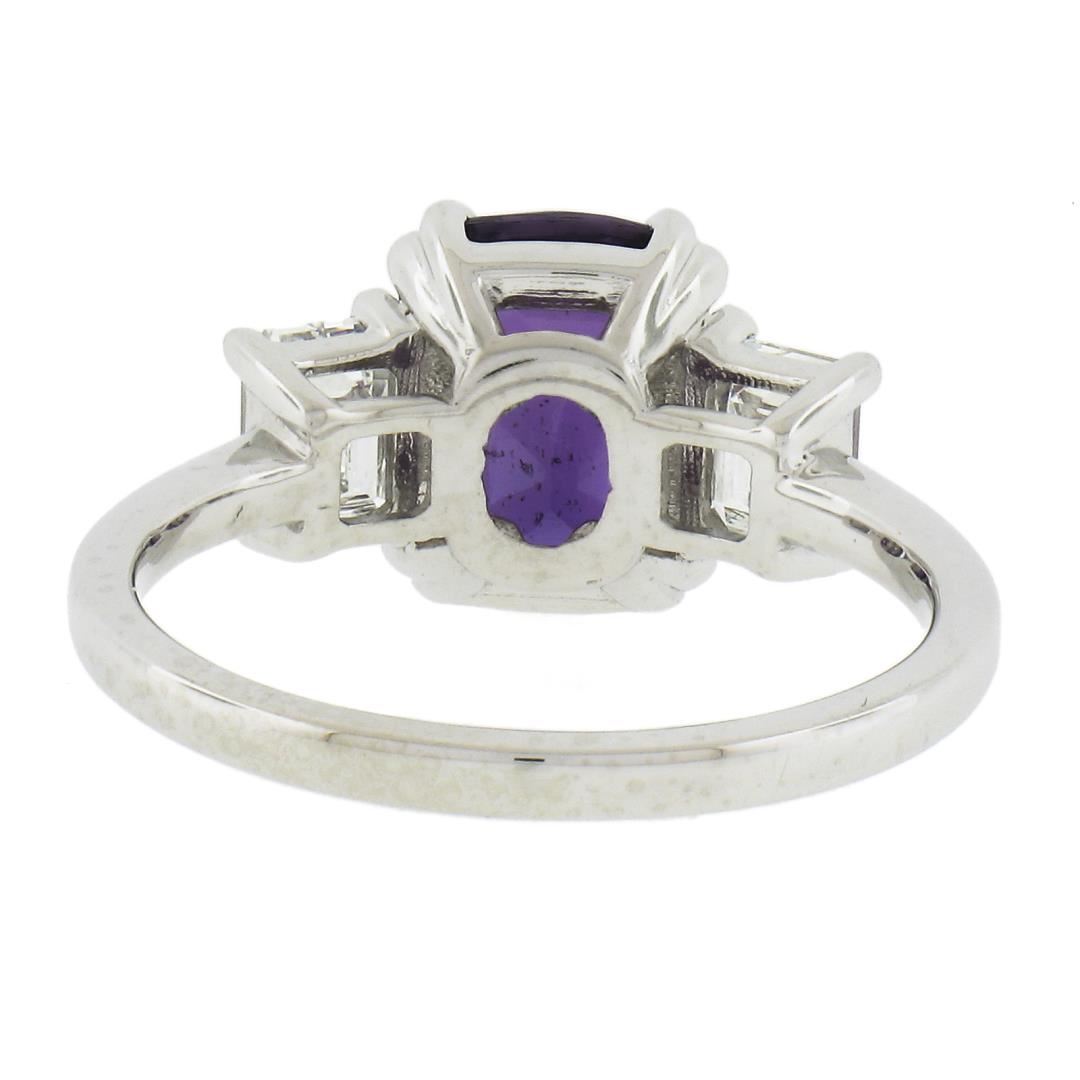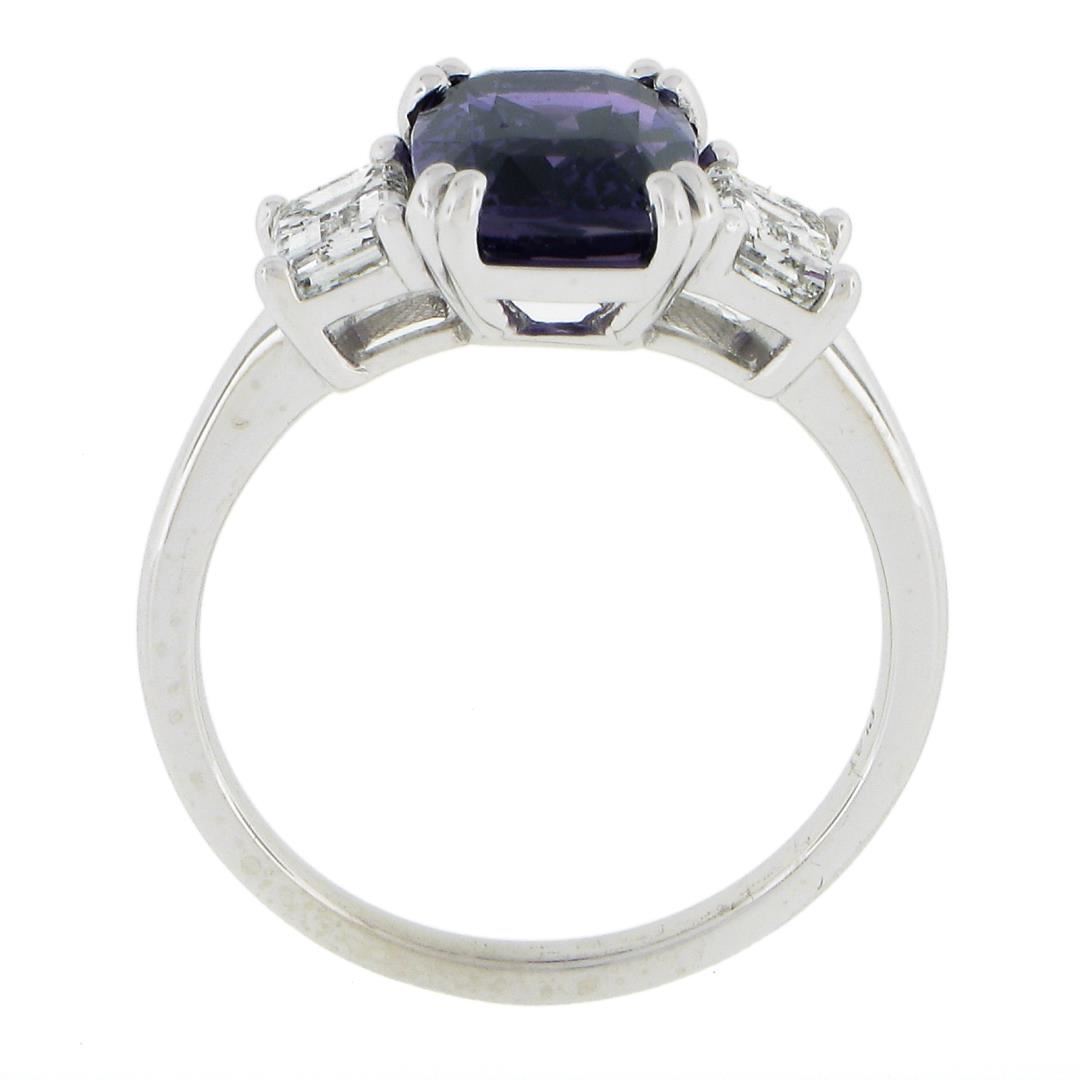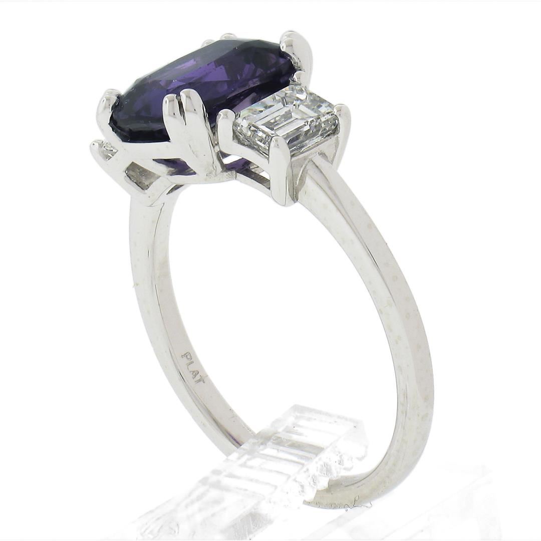 A new platinum 3 stones ring, with 3 GIA garded 1 cushion cut natural purple sapphire (3.01ct ), and 2 emerald cut natural diamonds (F - VS1 ; 0.91ctw). The ring is size 6.75, weighs a total of 5.30 grams, and measures 9.6mm wide. Comes with all original relevant certifications.