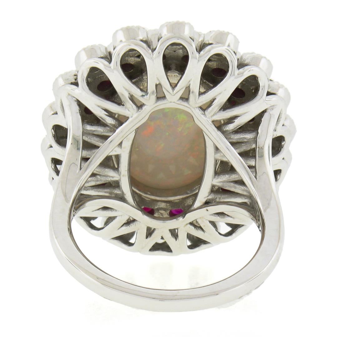 A new solid platinum cocktail ring, with 1 GIA graded oval cabochon cut natural opal (6.35ct ), 18 round cut natural diamonds (F/G - VS1/VS2 w/ a Few SI1 ; 0.81ctw), and 18 round cut natural rubies (1.04ctw). The ring is size 6.5, weighs a total of 15.74 grams, and measures 27.70mm wide. Comes with all original relevant certifications.