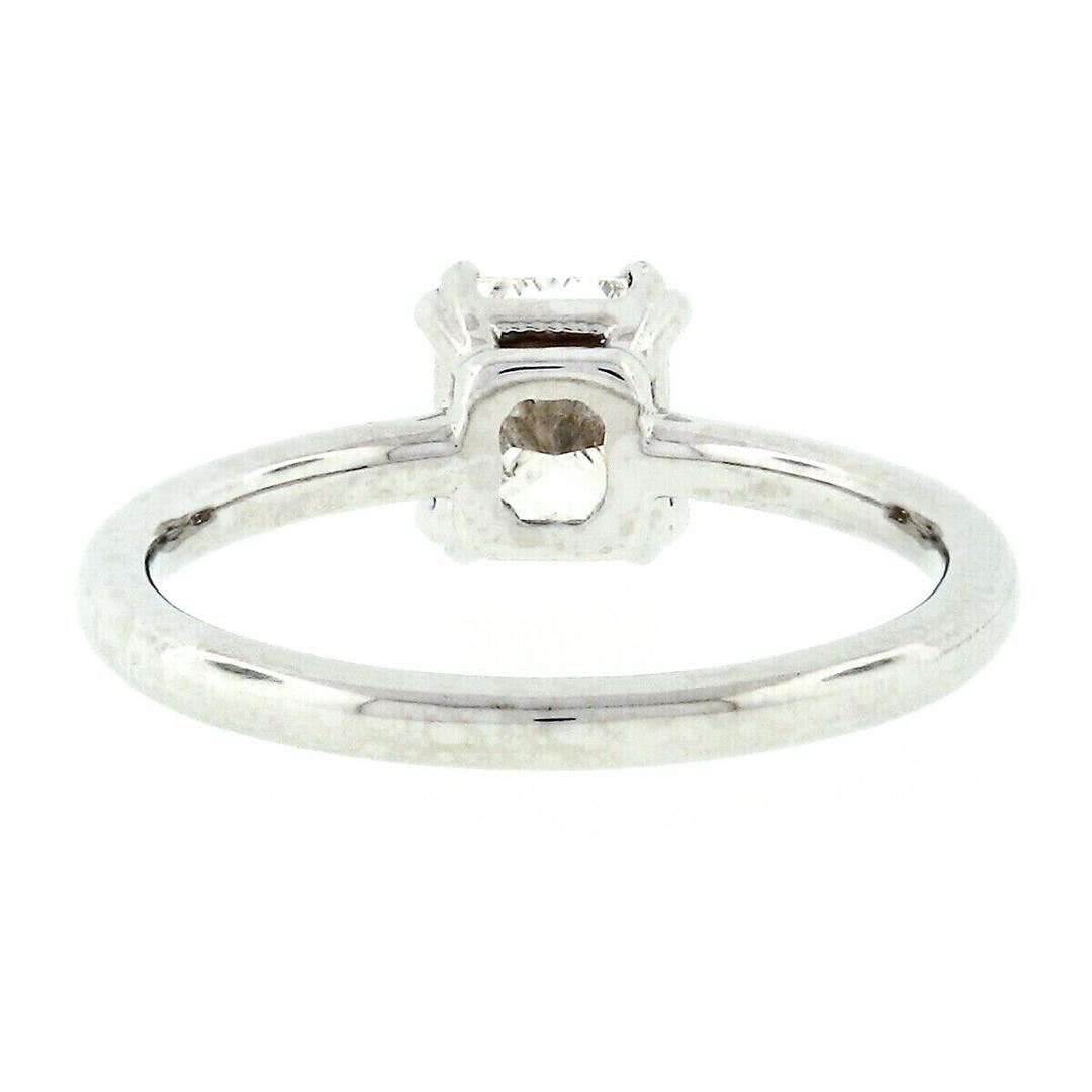 A new solid platinum solitaire ring, with 1 Gia certified rectangular brilliant natural diamond (H - VS2 ; 1.11 ct). The ring is size 6.5, weighs a total of 4.16 grams, and measures 7mm wide. Comes with all original relevant certifications.