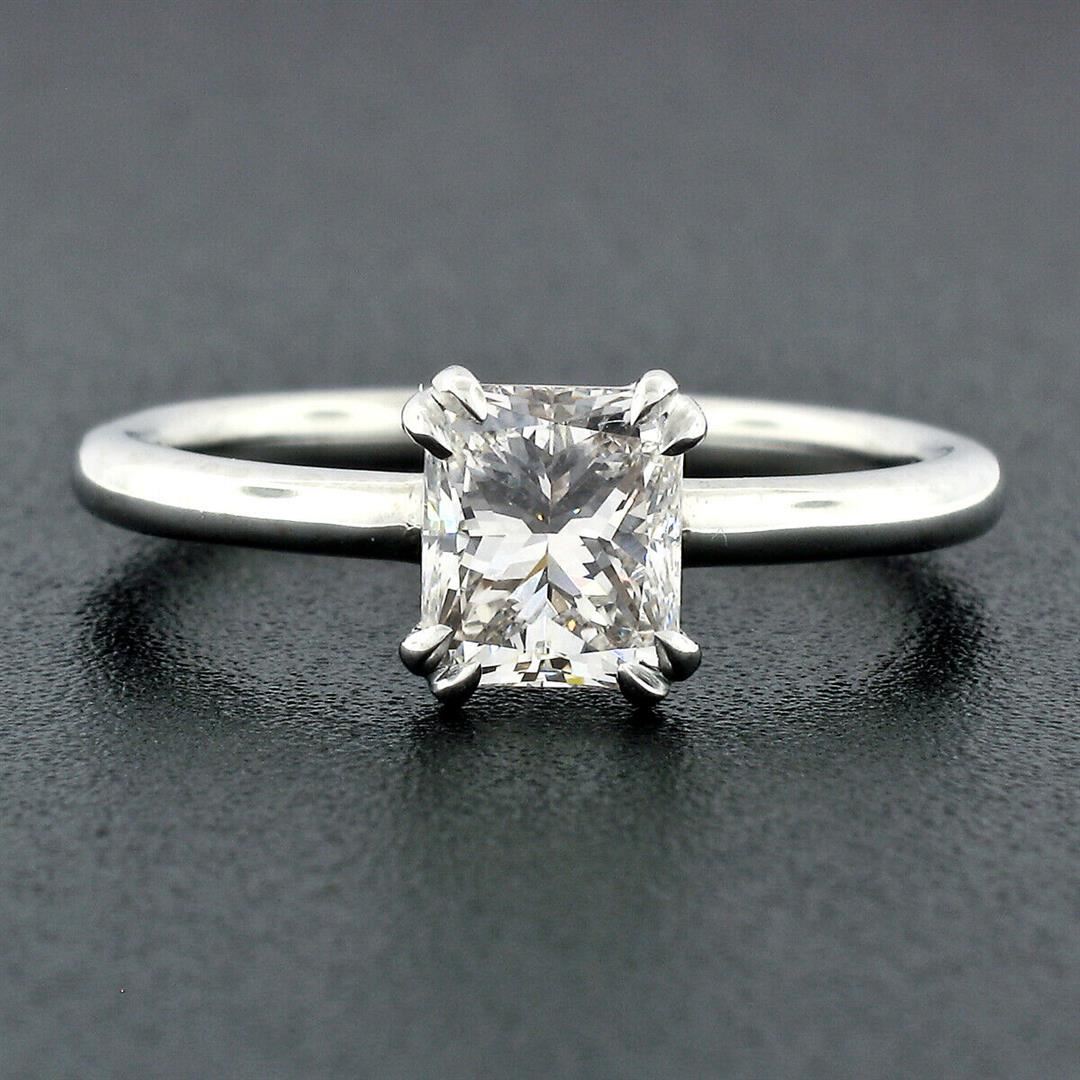 A new solid platinum solitaire ring, with 1 Gia certified rectangular brilliant natural diamond (H - VS2 ; 1.11 ct). The ring is size 6.5, weighs a total of 4.16 grams, and measures 7mm wide. Comes with all original relevant certifications.