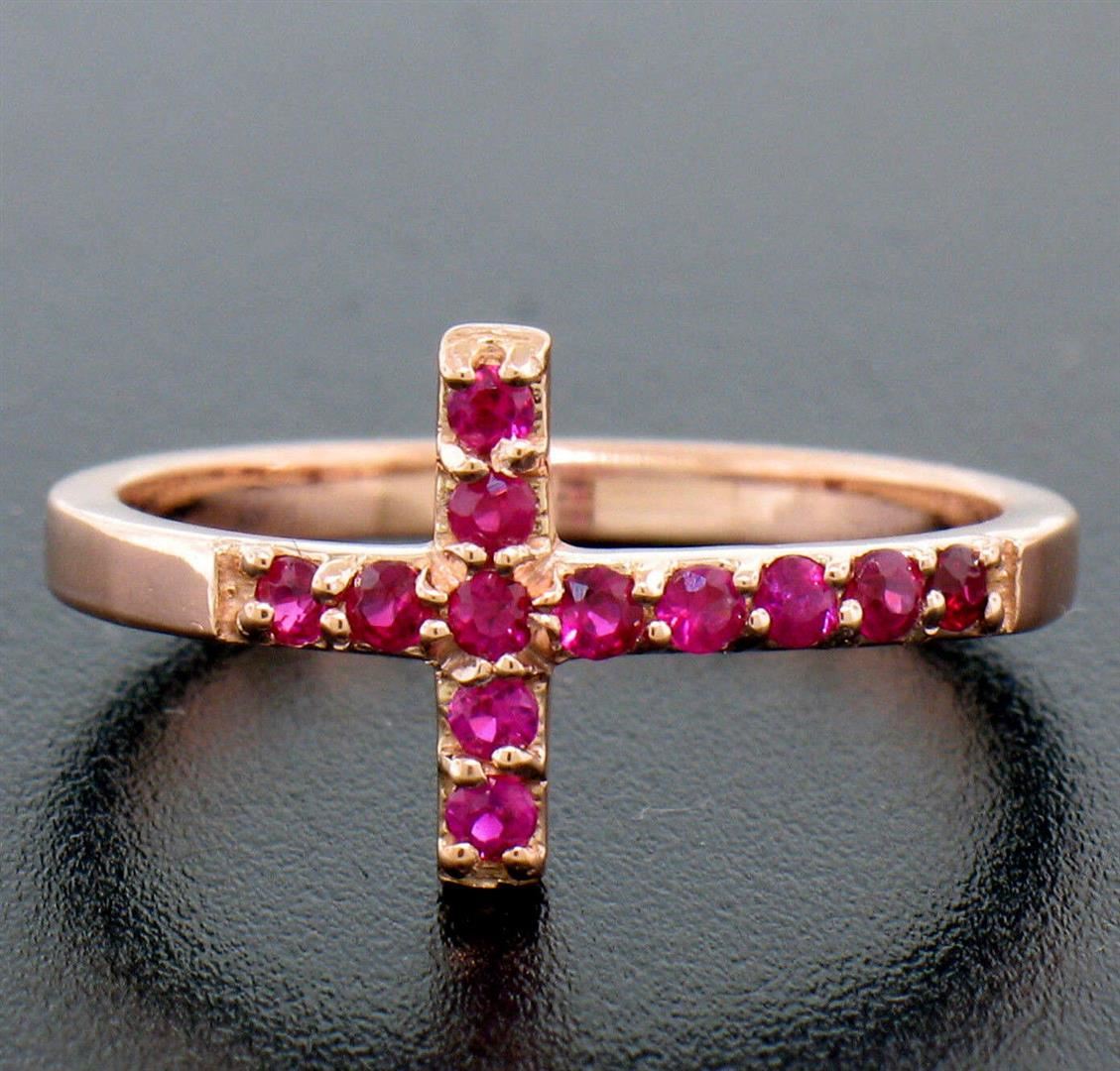 A new solid 14k rose gold cross band ring, with 12 round brilliant cut natural rubies (0.25ctw). The ring is size 6.0, weighs a total of 2.3 grams, and measures 11.0mm wide.