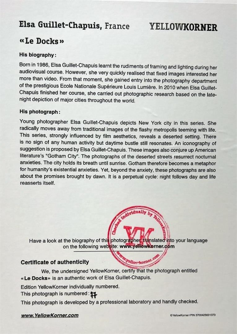NYC Docks Hoffa Truck Elsa Guillet-Chapuis Le Docks YellowKorner Certified Photograph. Certificate of Authenticity from YellowKorner affixed to the back. Matted Dimensions 16"x20". Protected with Clear Mylar Sleeve.