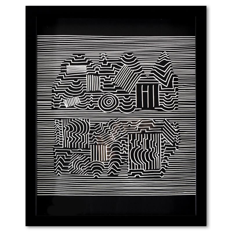 "Naissances - II de la serie Ondulatoires" is a heliogravure print on paper published in 1973 by Victor Vasarely (1908-1997). This piece comes custom framed with a letter of authenticity and with a 1976 Vasarely paperback. Measures approx. 12.5" x 15" (frame) 10" x 13" (image).