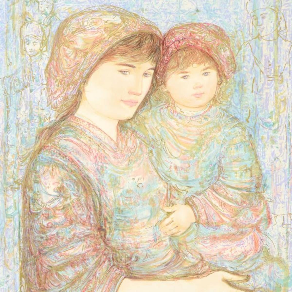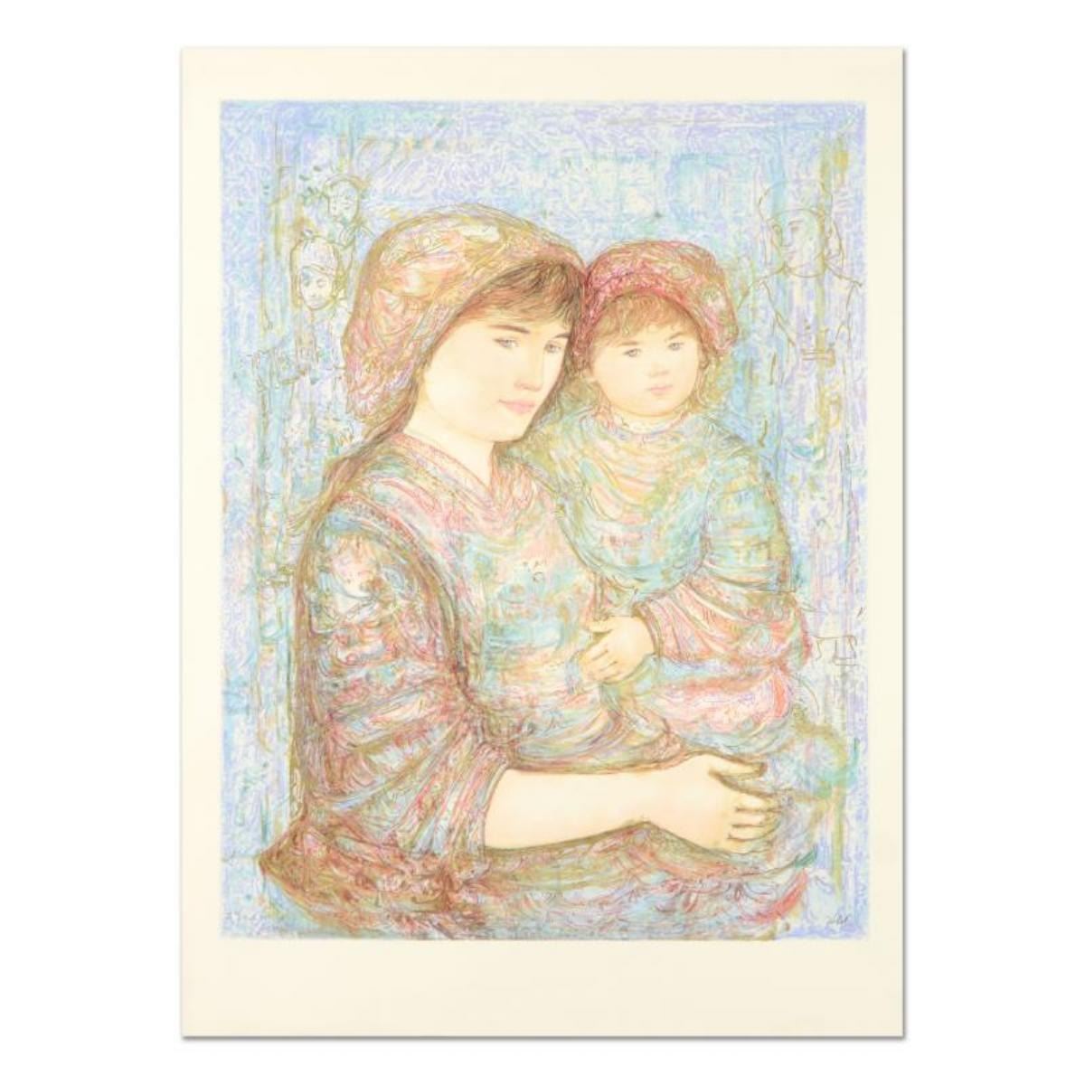 "Naomi" is a limited edition lithograph on paper by Edna Hibel (1917-2014), numbered and hand signed by the artist. Includes Certificate of Authenticity. Measures approx. 29" x 41" (border), 26" x 34.5" (image).