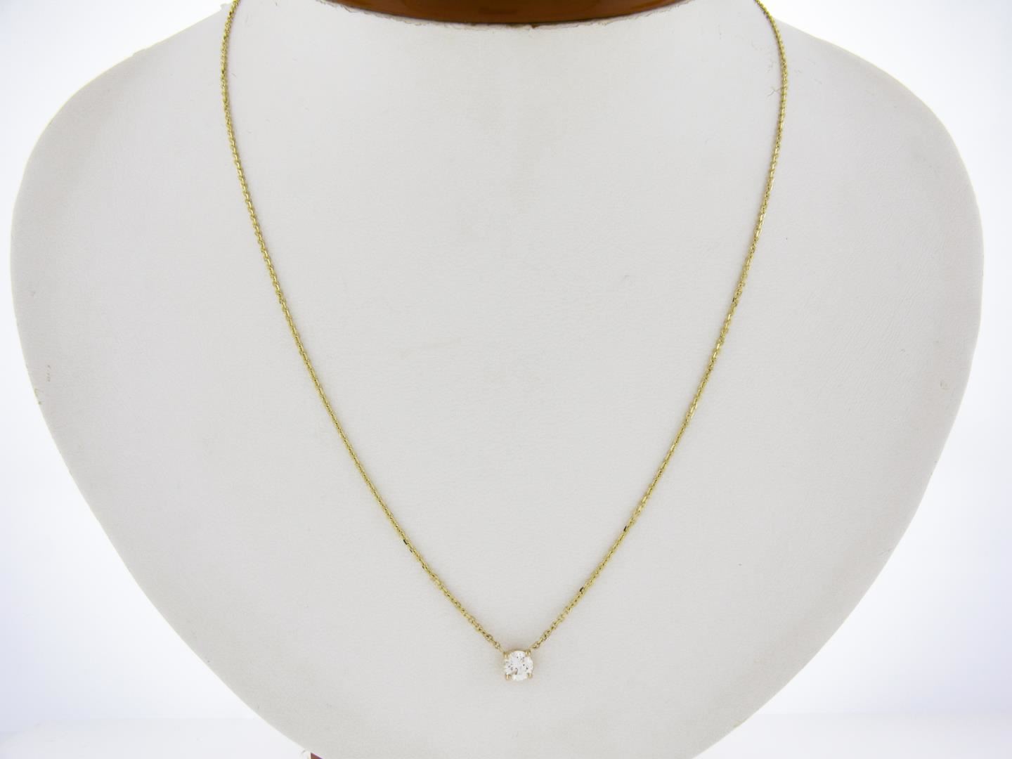 A new solid 14k yellow gold solitaire pendant necklace, with 1 round cut natural diamond (J - I1 ; 0.49ct). Adjustable 16 or 18 inch cable link chain, 2.32 grams total weight, pendant measures 5.9mm in diameter.
