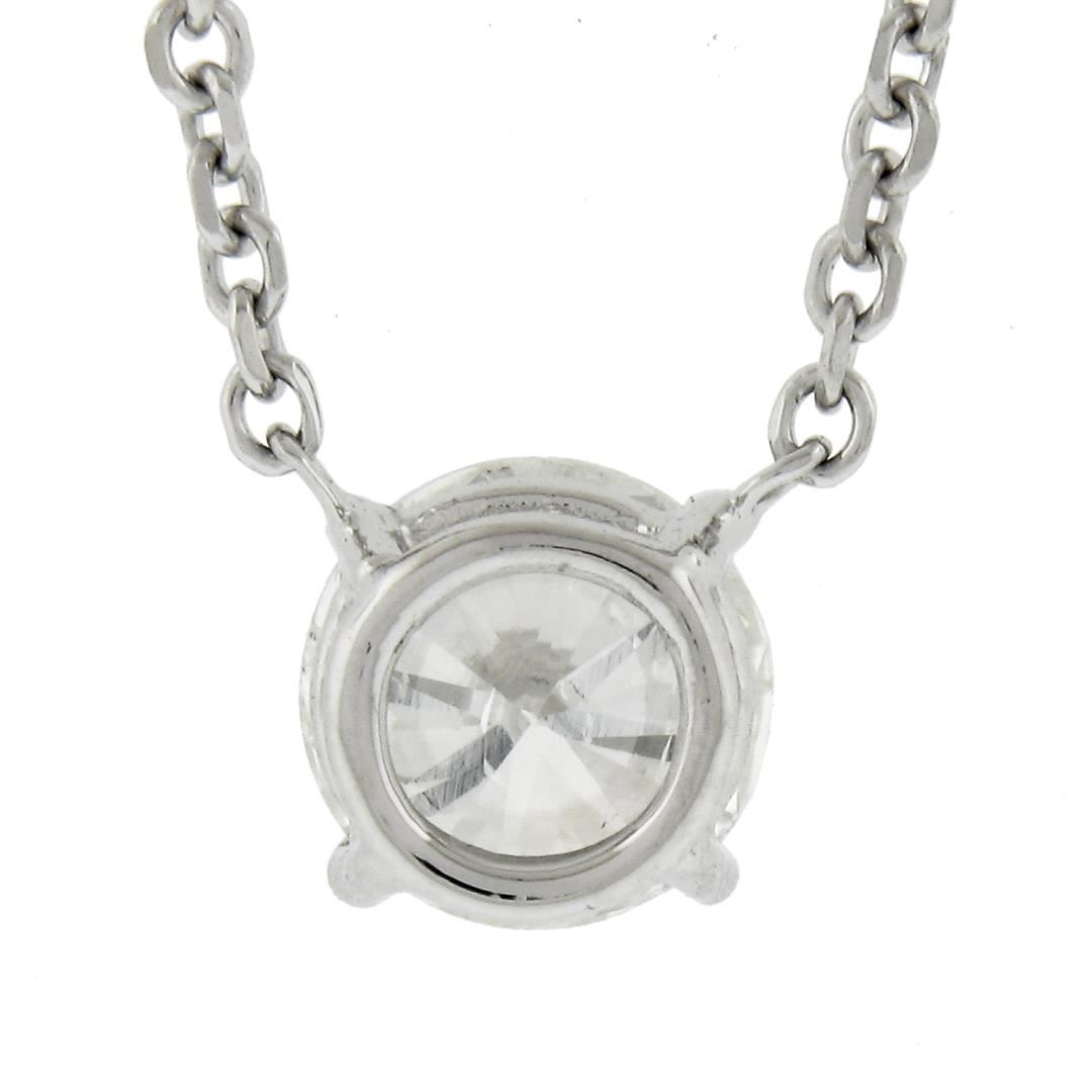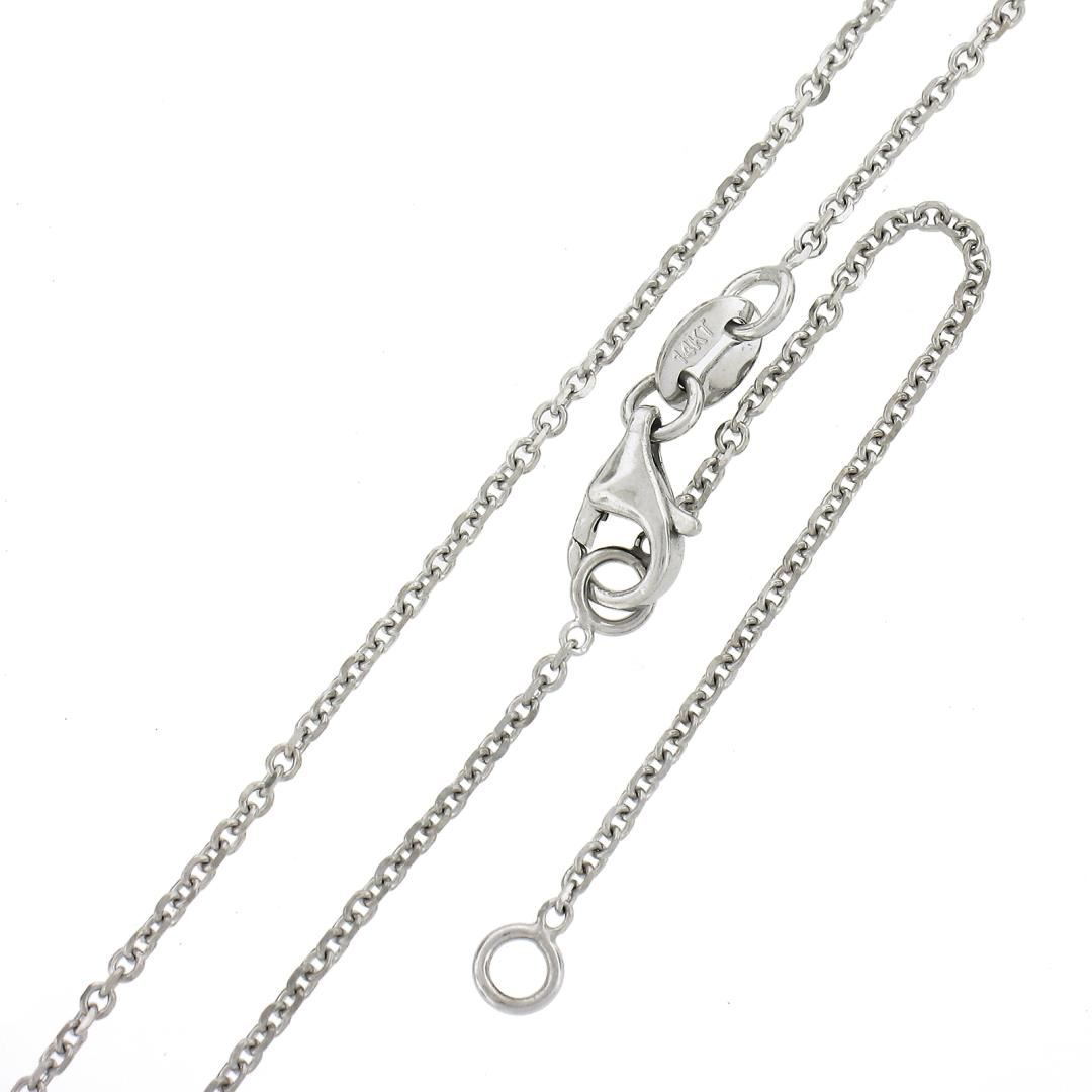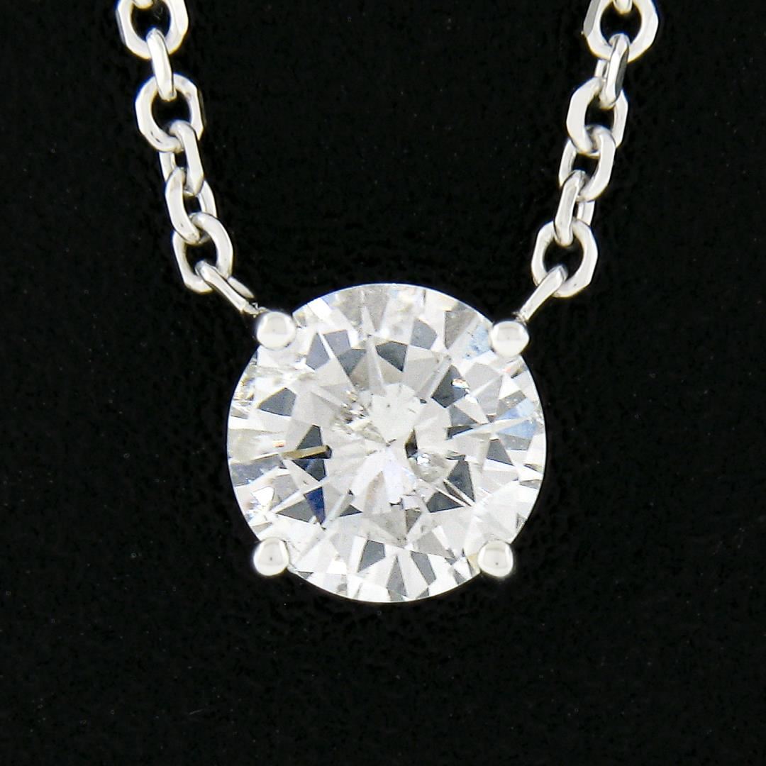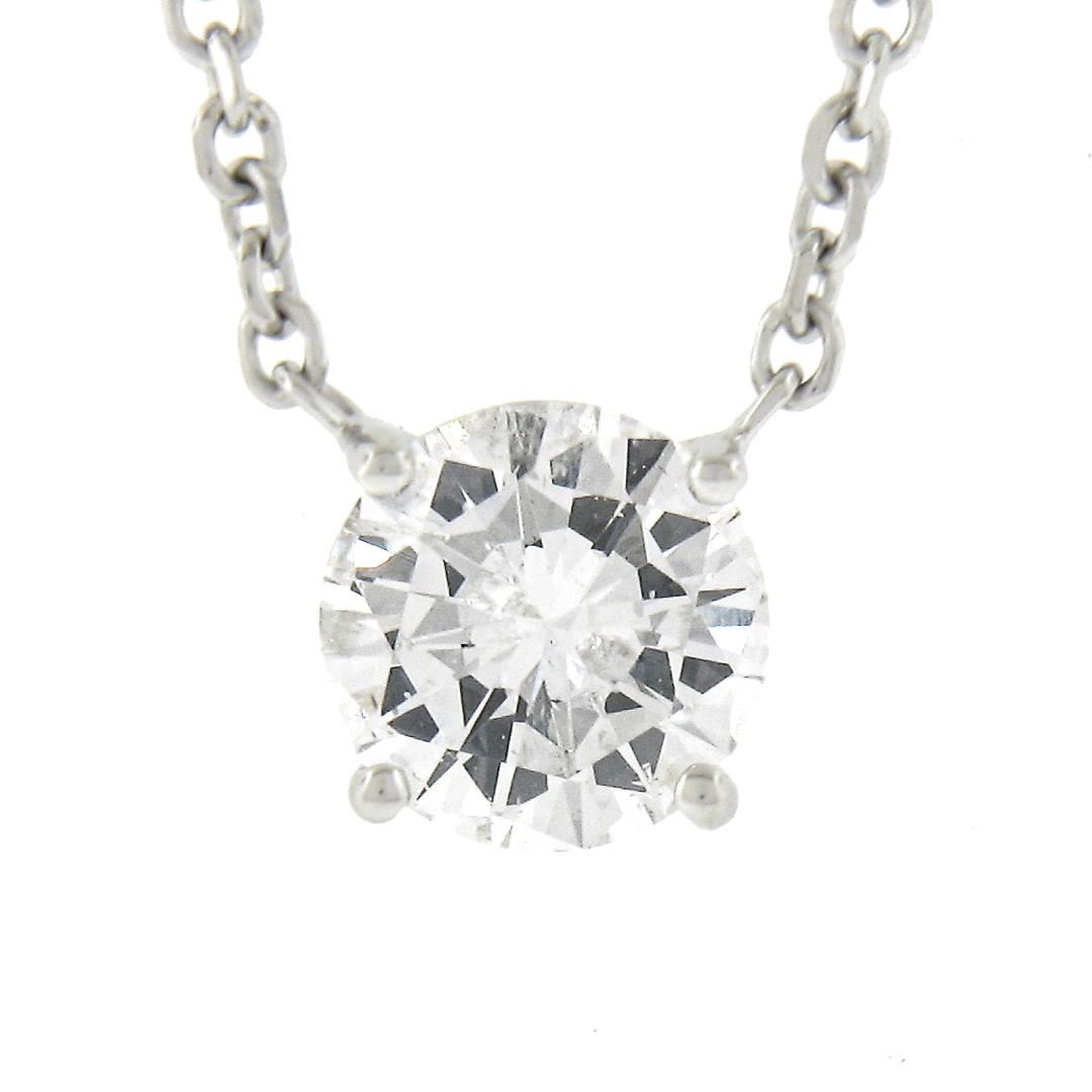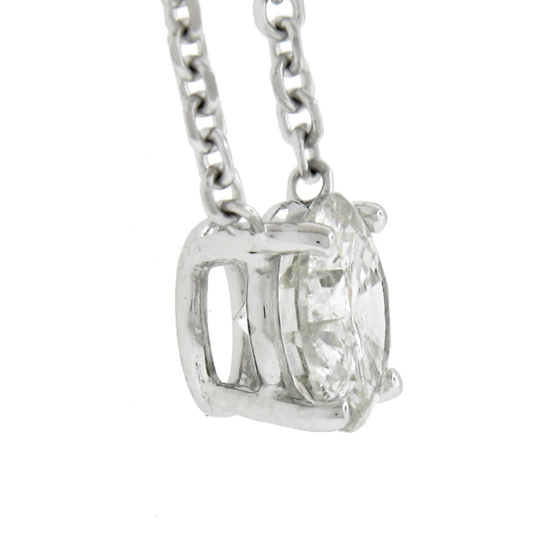A new solid 14k white gold solitaire pendant necklace, with 1 round cut natural diamond (G - I2 ; 0.62ct). Adjustable at 16 or 18 inch cable link chain, 2.44 grams total weight, pendant measures 6.5mm.