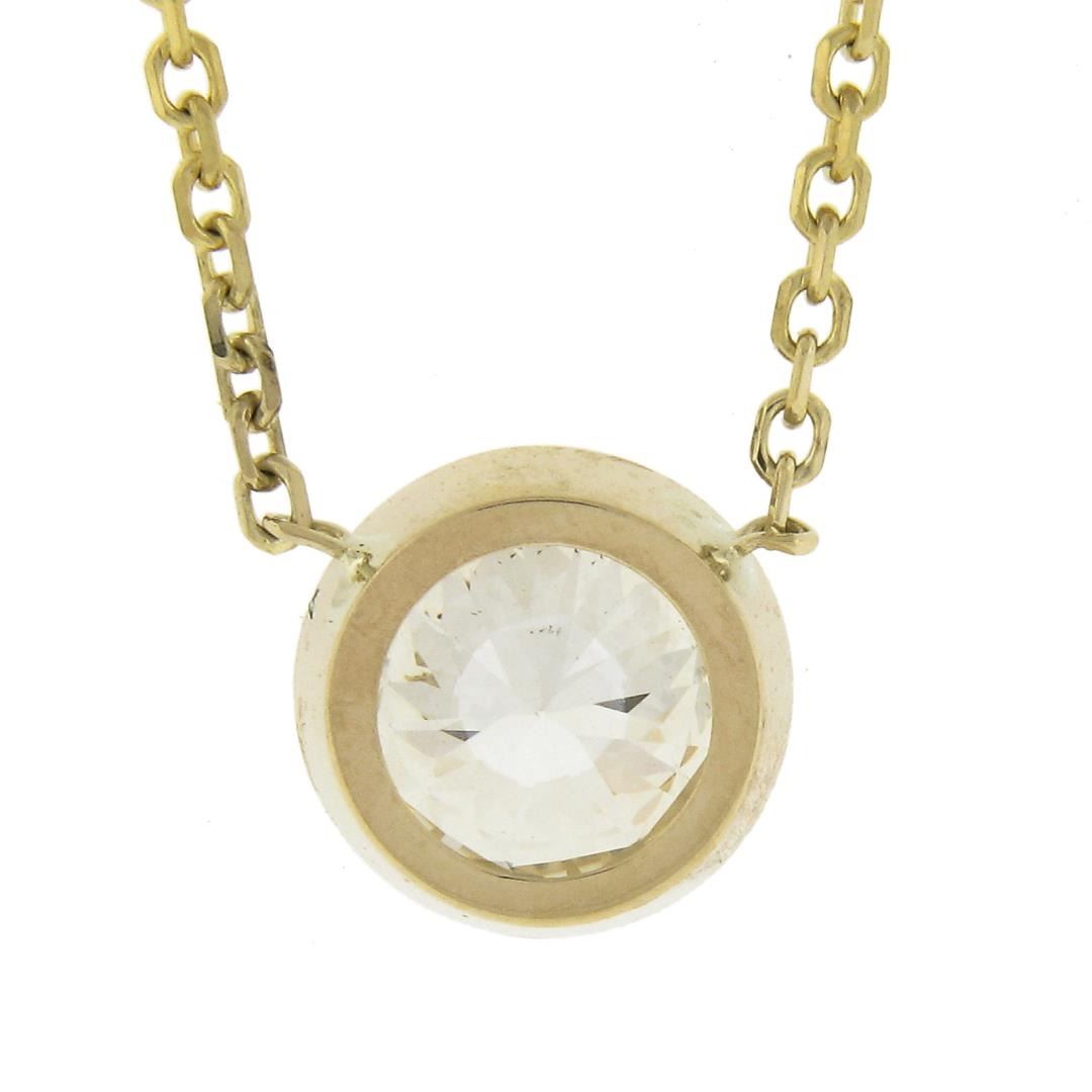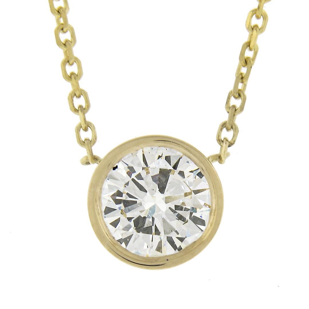 A new solid 14k yellow gold solitaire pendant necklace, with 1 round cut natural diamond (I - VS2 ; 0.67ct). Adjustable at 16, 17 or 18 inch cable link chain, 2.15 grams total weight, pendant measures 6.9mm.