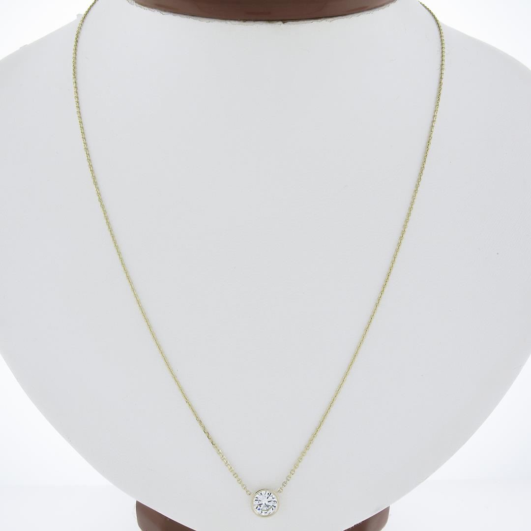 A new solid 14k yellow gold solitaire pendant necklace, with 1 round cut natural diamond (I - VS2 ; 0.67ct). Adjustable at 16, 17 or 18 inch cable link chain, 2.15 grams total weight, pendant measures 6.9mm.