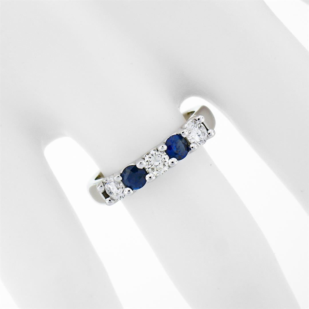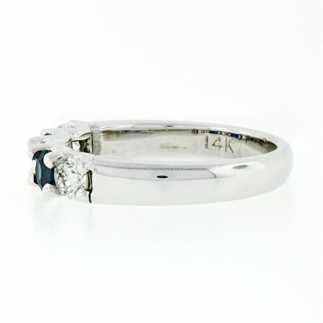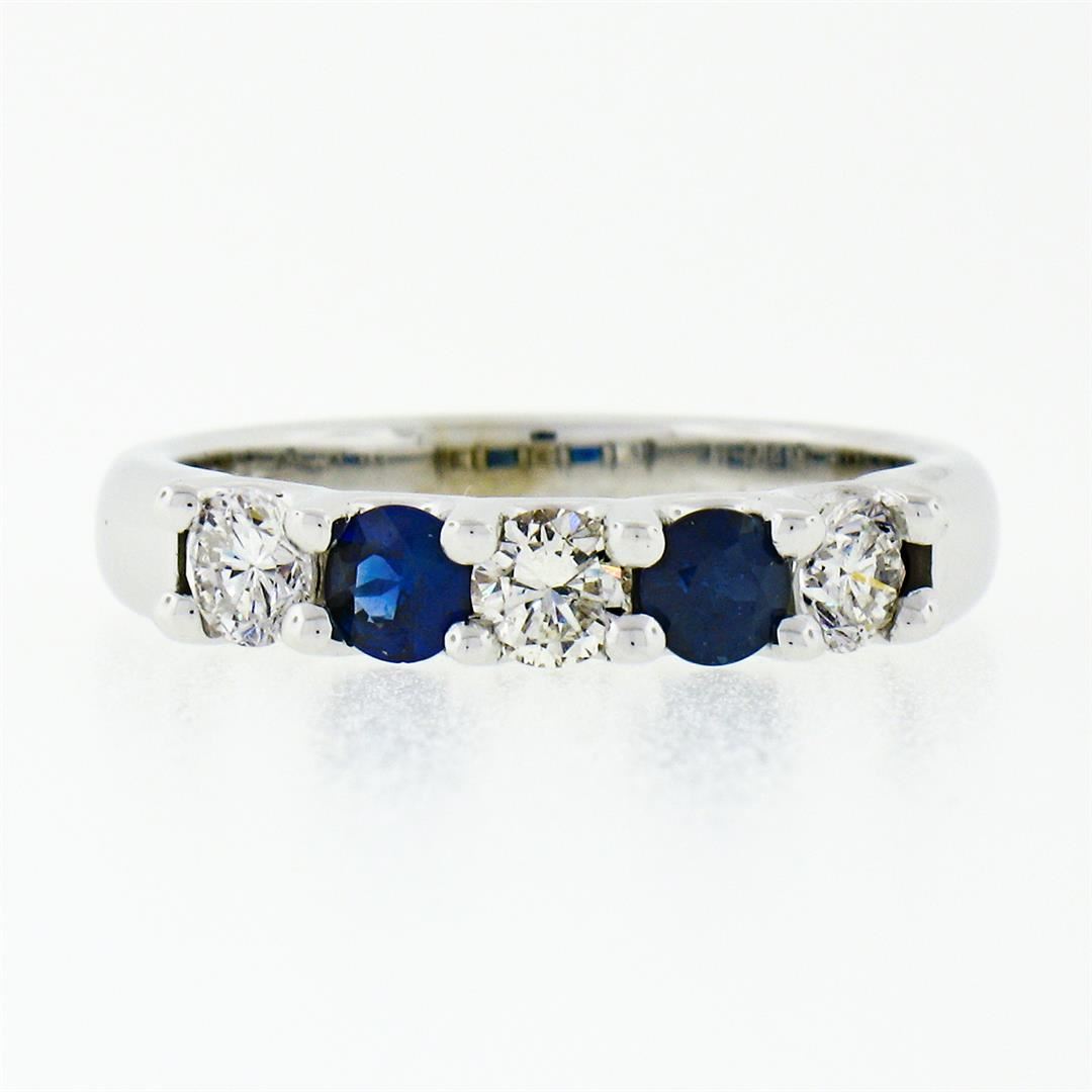 A new solid 14k white gold band ring, featuring 2 round brilliant cut natural sapphires (0.38ctw), alternated with 3 round brilliant cut natural diamonds (G - VS2 ; 0.51ctw). The ring is size 6.0, weighs a total of 3.71 grams, and measures 3.7mm wide.