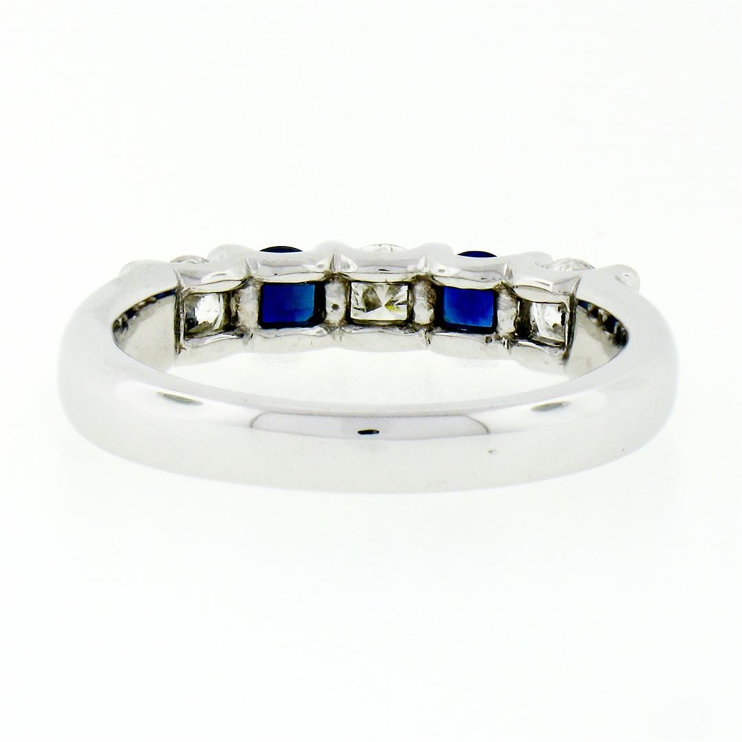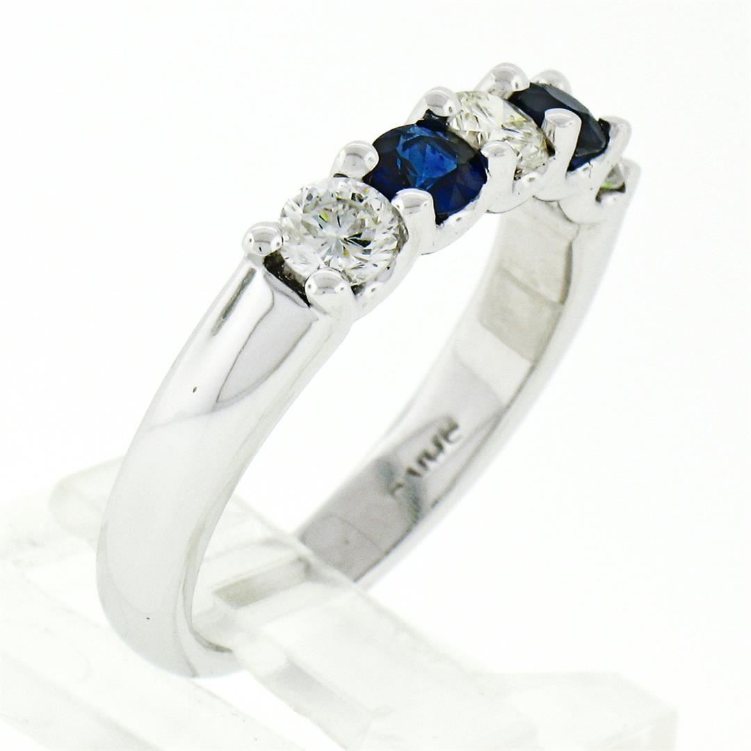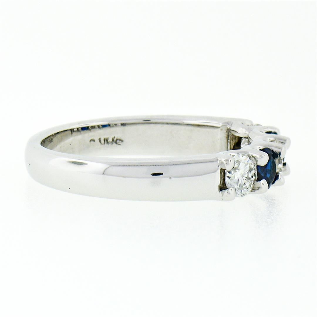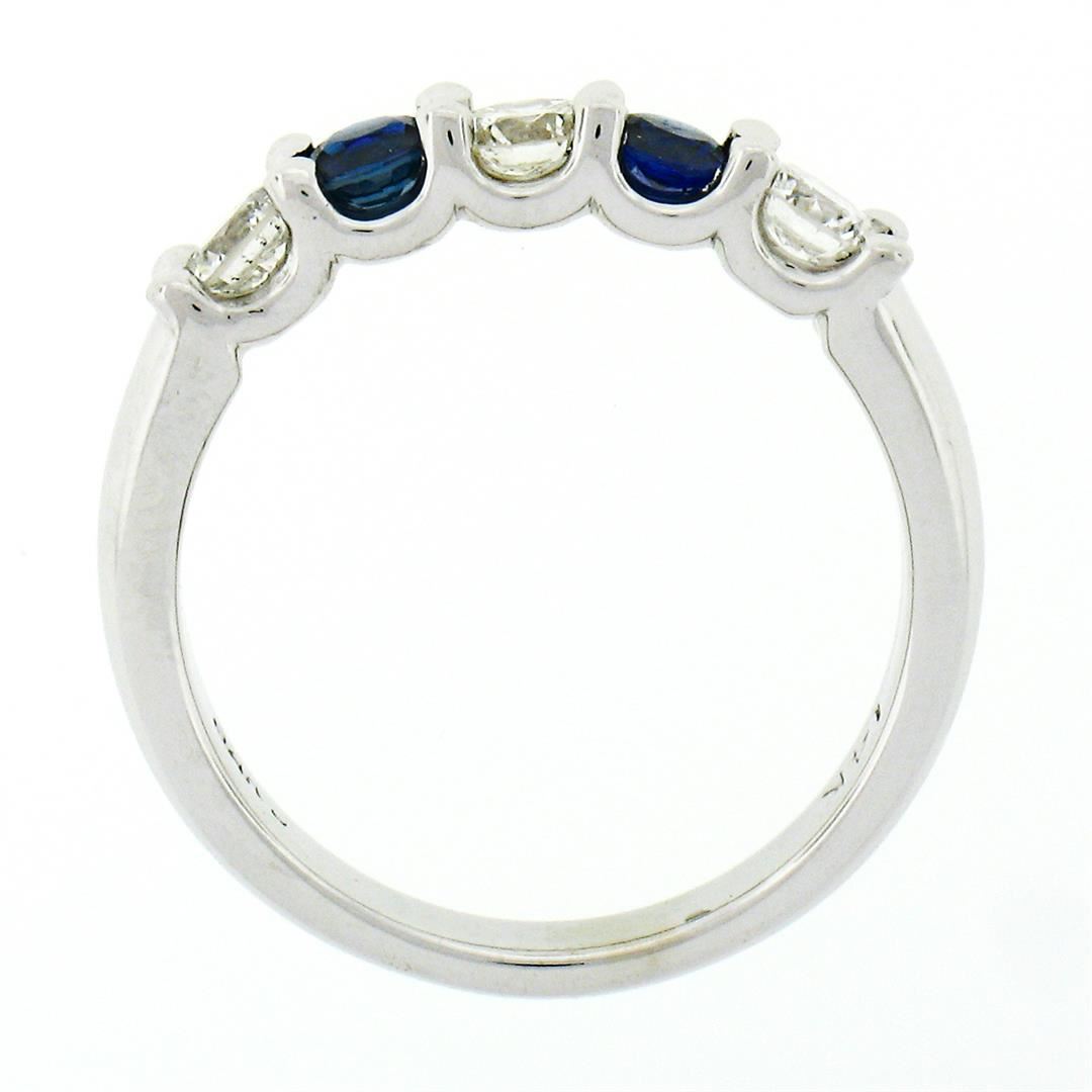 A new solid 14k white gold band ring, featuring 2 round brilliant cut natural sapphires (0.38ctw), alternated with 3 round brilliant cut natural diamonds (G - VS2 ; 0.51ctw). The ring is size 6.0, weighs a total of 3.71 grams, and measures 3.7mm wide.