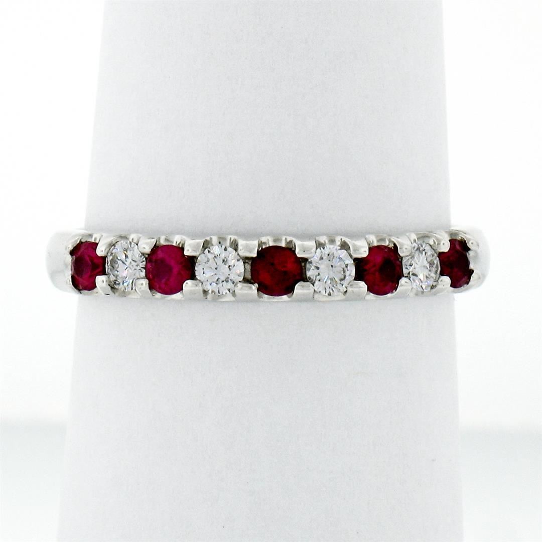 A new 14k white gold band ring, with 5 round brilliant cut natural rubies (0.34ctw), alternated with 4 round brilliant cut natural diamonds (F/G- VS1/VS2; 0.28ctw). The ring is size 7.0, weighs a total of 2.59 grams, and measures 3.0mm wide.