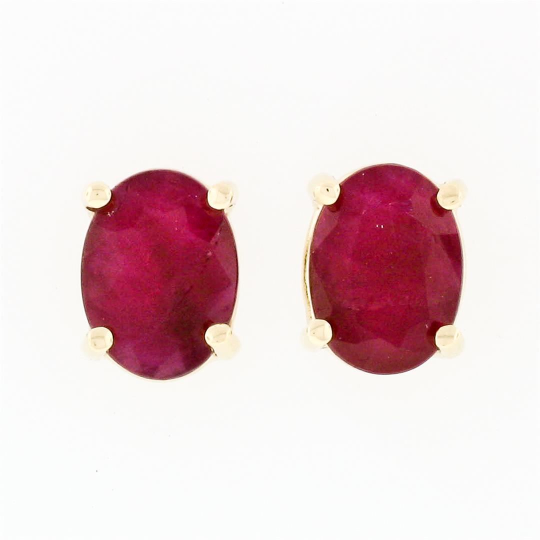 A new solid 14k yellow gold stud earrings, with 2 oval cut natural rubies (7.00x5.10mm- 2.00ctw). The earrings measure approximately 7.10x5.25mm and weigh a total of 1.44 grams.