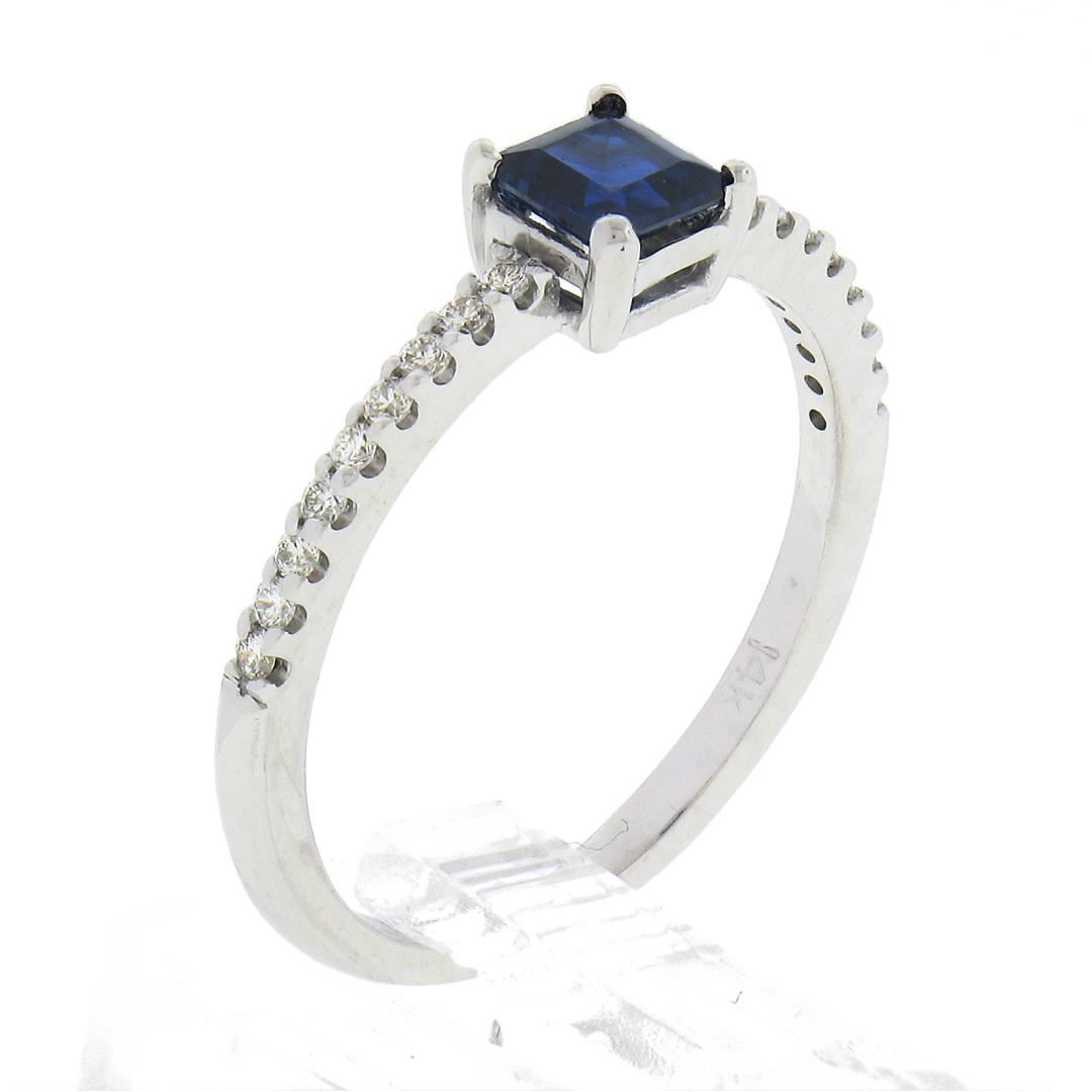 a new solid 14k white gold ring, with 1 square step cut natural sapphire (0.50ct), and 18 round cut natural diamonds (F/G - VS1/VS2 ; 0.18ctw ). The ring is size 7.0, weighs a total of 2 grams, and measures 5.3mm wide.