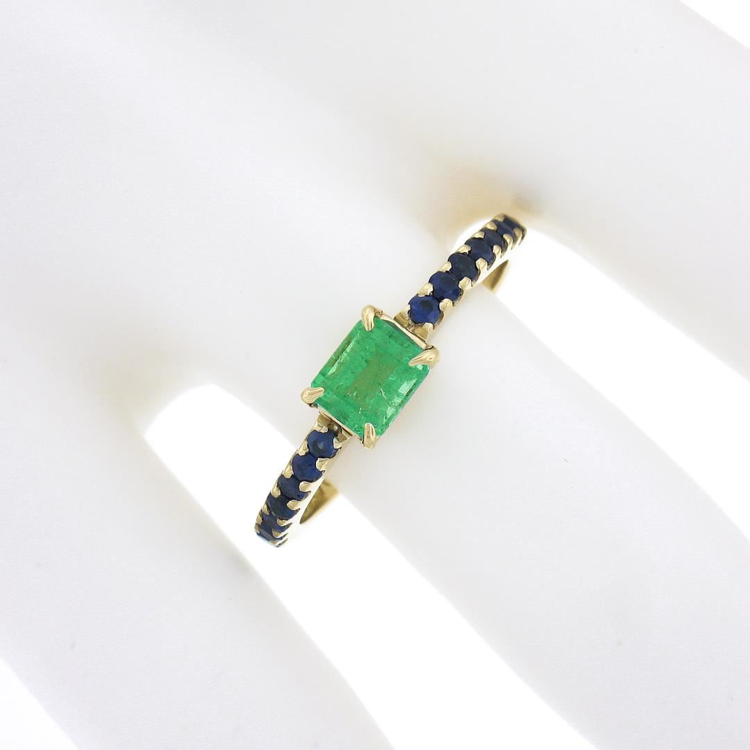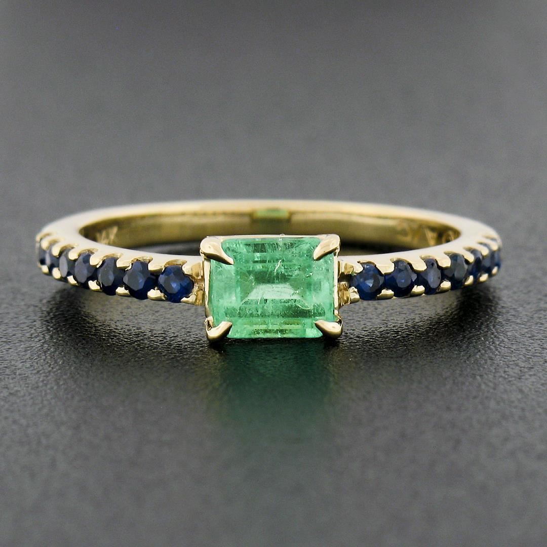 A new solid 14k yellow gold ring, with 1 sideways emerald cut natural emerald ( 0.67 ct), and 14 round cut natural sapphires (0.35 ctw). The ring is size 8.0, weighs a total of 2.75 grams, and measures 4.85mm wide.