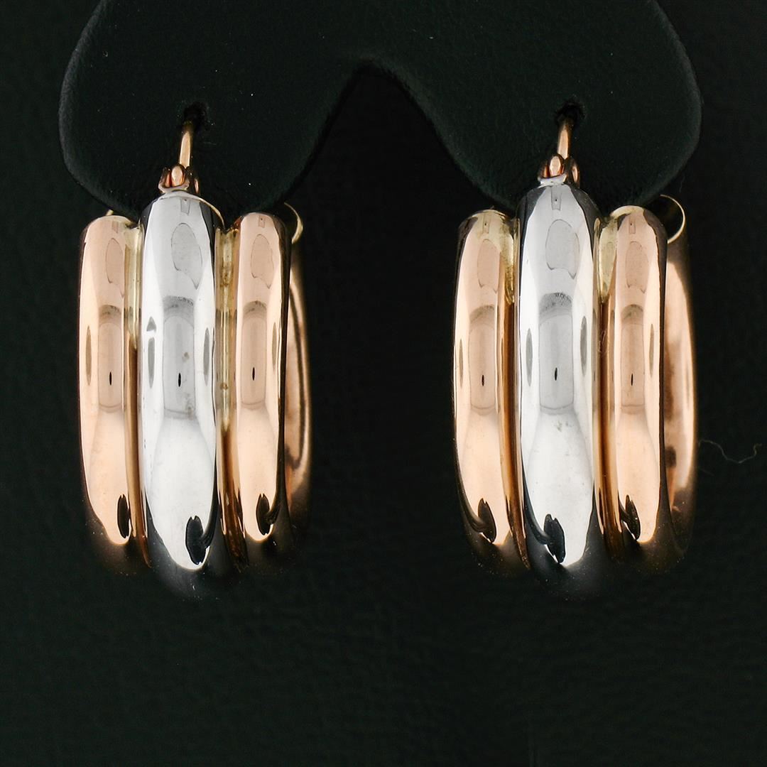A new pair of 14k white and rose gold hoop earrings featuring a puffed triple tube design. The earrings measure approximately 10.25mm wide, 22.65mm in diameter, and weigh a total of 6.00 grams.