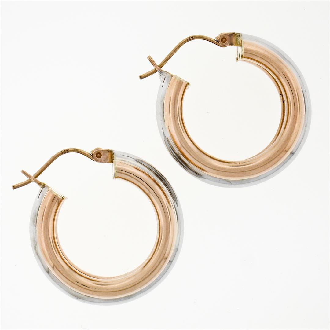 A new pair of 14k white and rose gold hoop earrings featuring a puffed triple tube design. The earrings measure approximately 10.25mm wide, 22.65mm in diameter, and weigh a total of 6.00 grams.