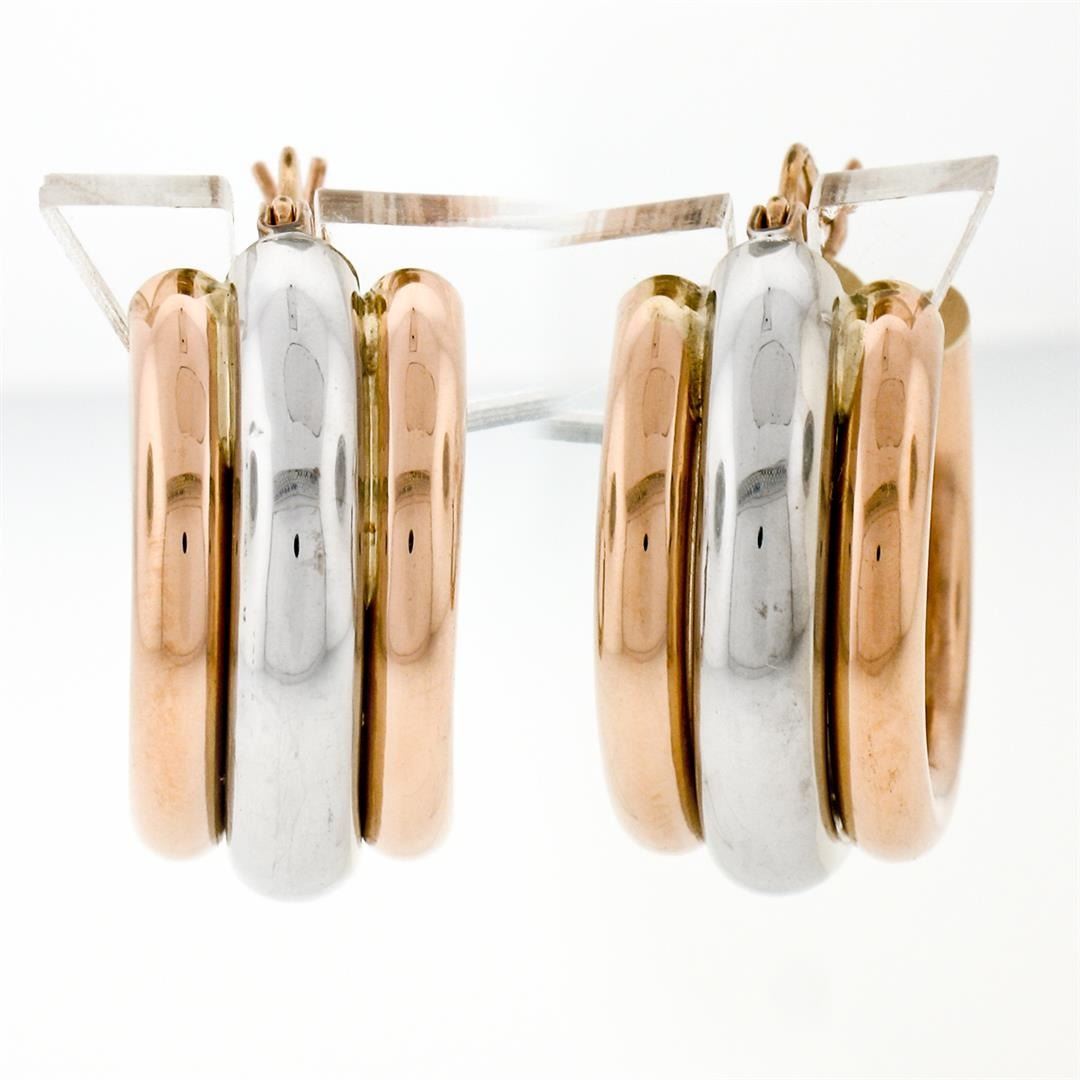 A new pair of 14k white and rose gold hoop earrings featuring a puffed triple tube design. The earrings measure approximately 10.25mm wide, 22.65mm in diameter, and weigh a total of 6.00 grams.
