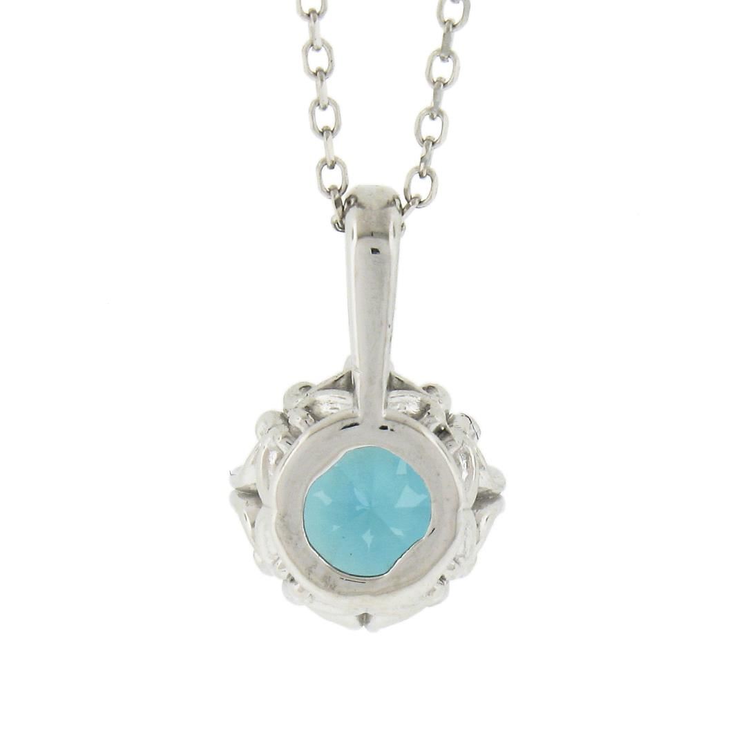 A new solid 14k white gold pendant necklace, with 1 round cut natural zircon (1.5ct). Adjustable 16 or 18 inch cable link chain, 2.02 grams total weight, pendant measures 12.5x7.6mm.