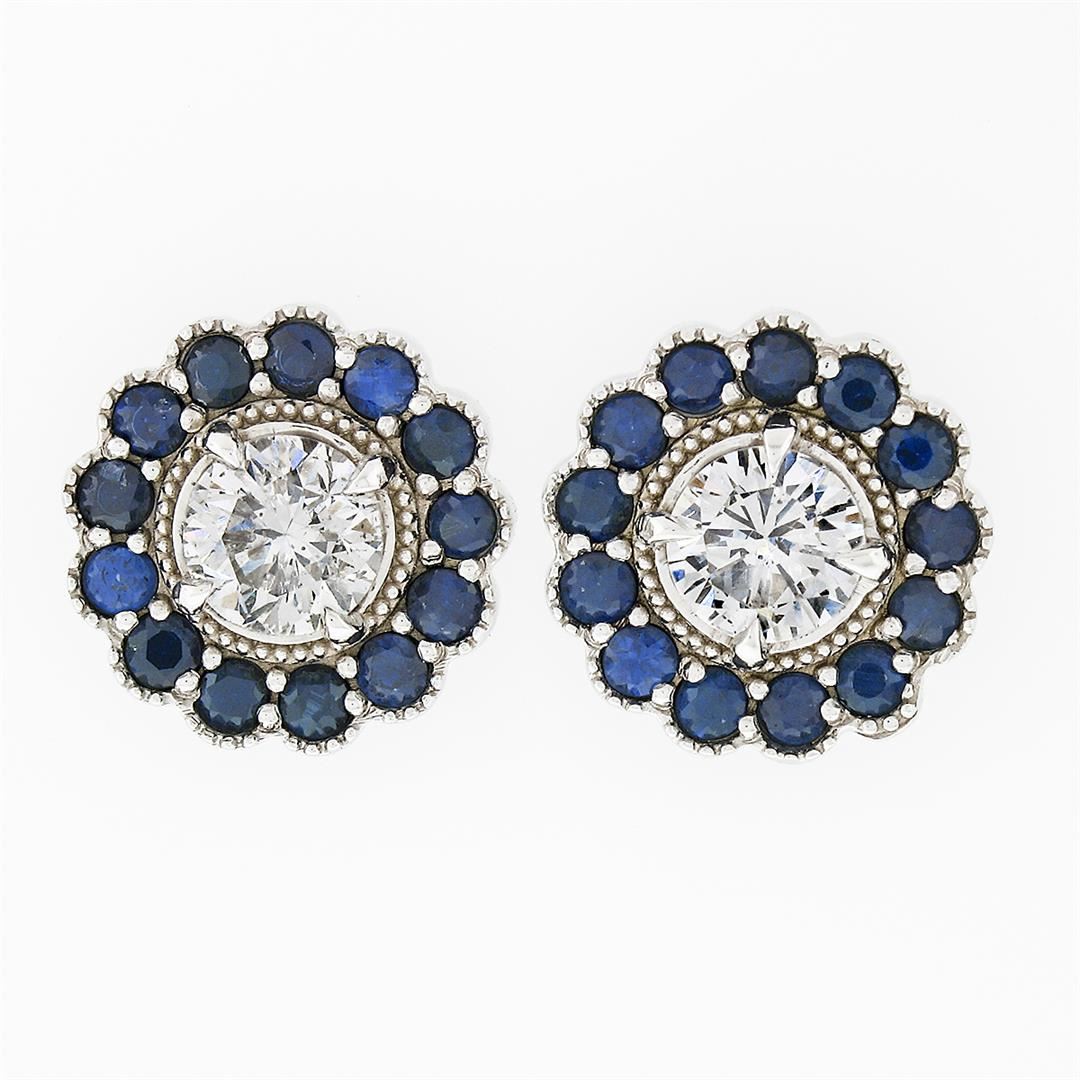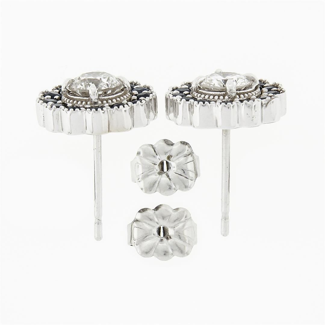 a new solid 14k white gold stud earrings, with 26 round brilliant cut natural sapphires (0.70ctw), & 2 round brilliant cut natural diamonds (G/H- VS2/SI1; 0.81ctw). The earrings measure approximately 10.7mm in diameter and weigh a total of 3.94 grams.
