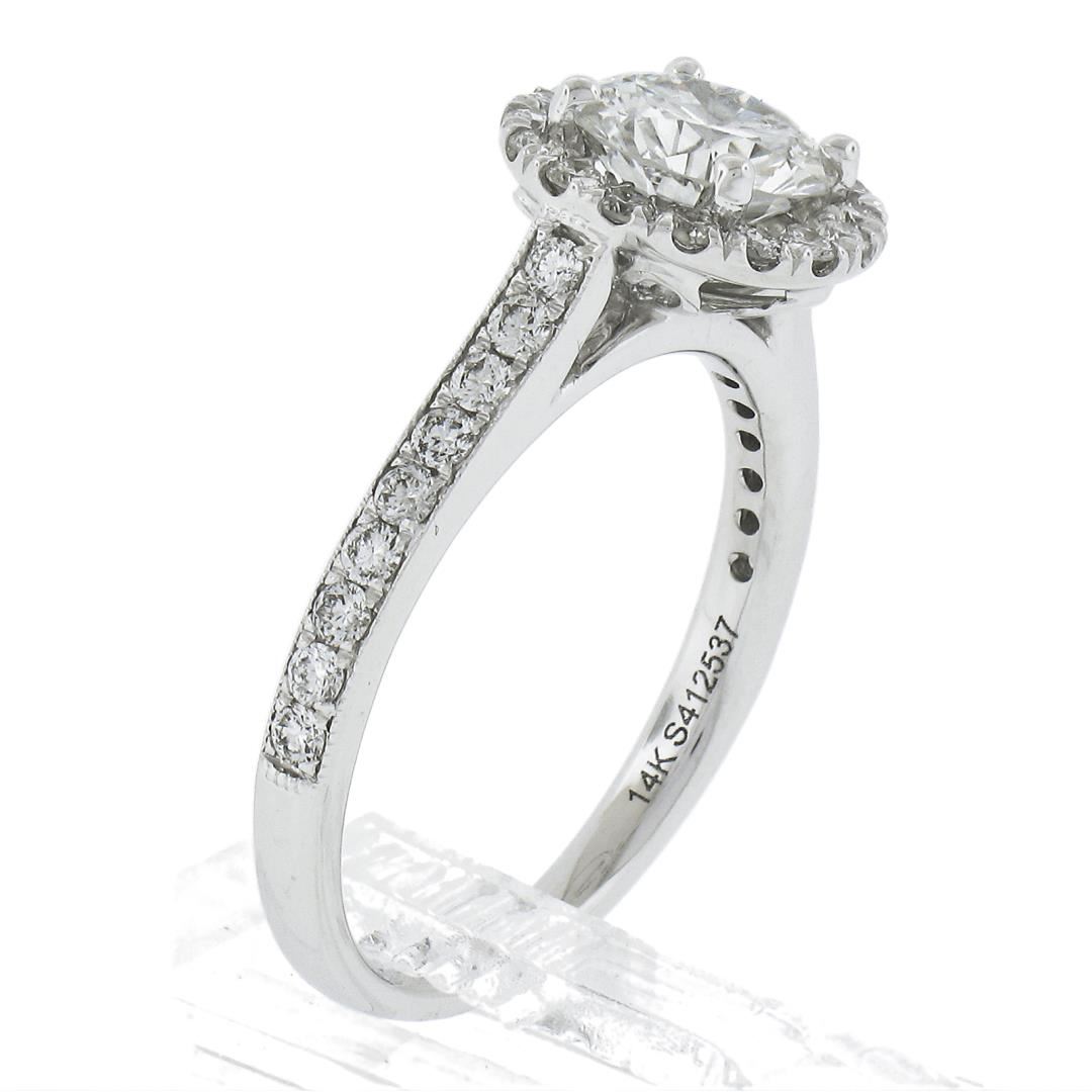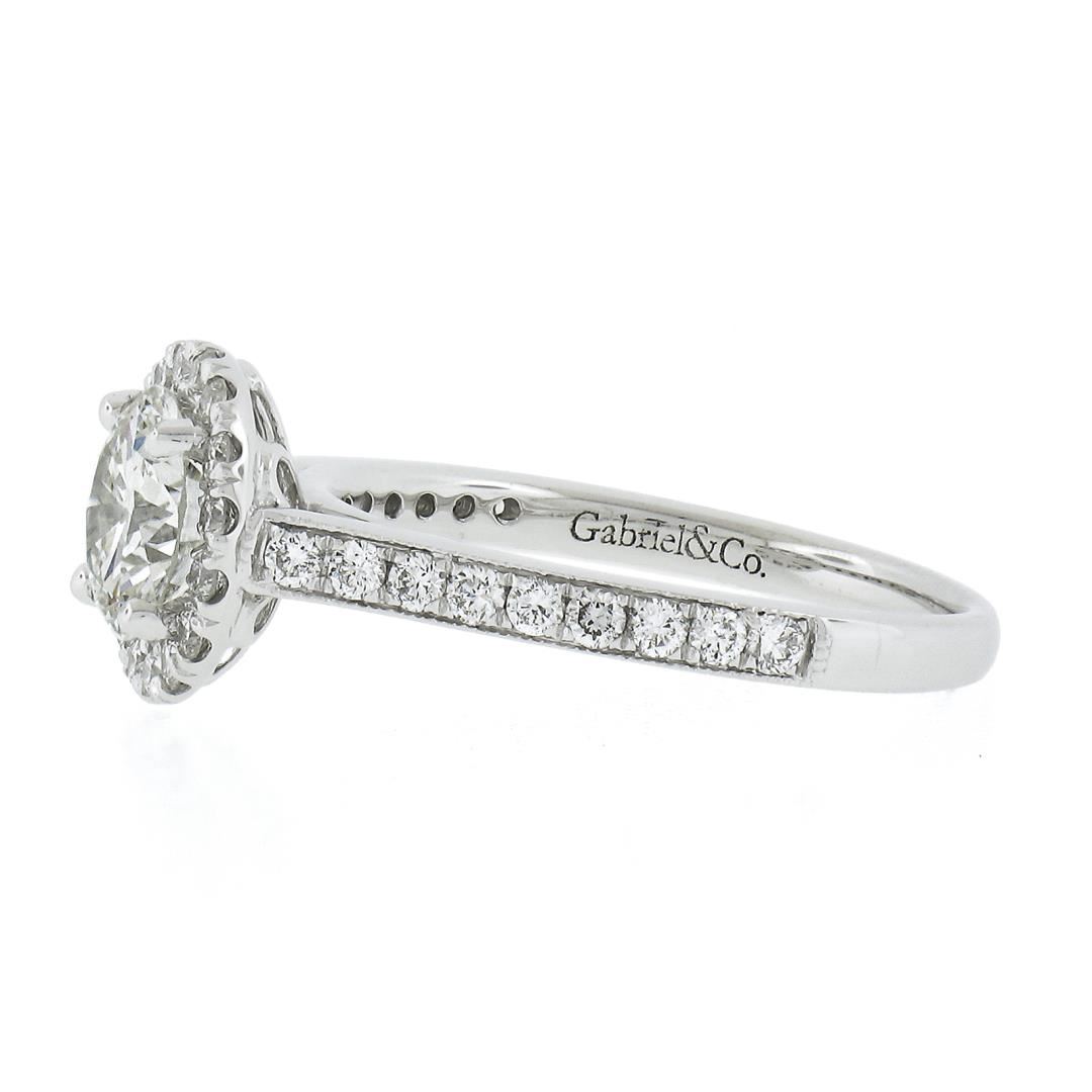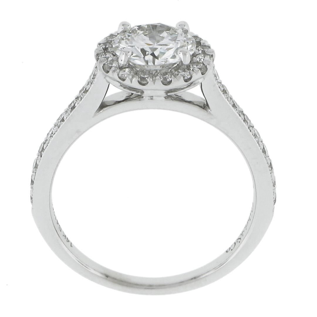 A new solid 14k white gold engagement ring, featuring 1 GIA round cut natrual diamond (F - SI1 ; 1.11ct ), with a halo of round cut natural diamonds (F/G - VS1/VS2 ; 0.48ctw). The ring is size 6.5, weighs a total of 3.20 grams, and measures 9.6mm wide. Comes with all original relevant certifications.