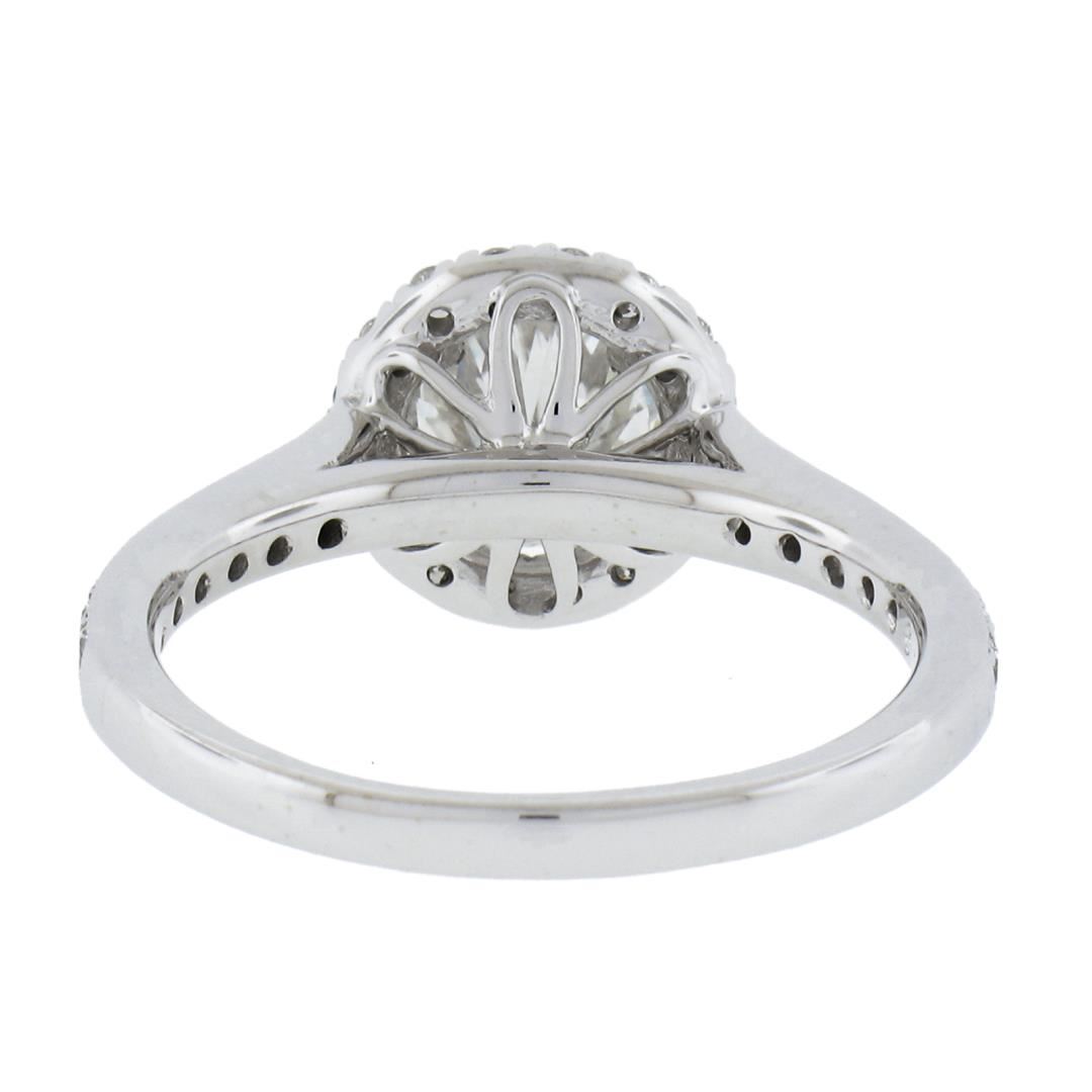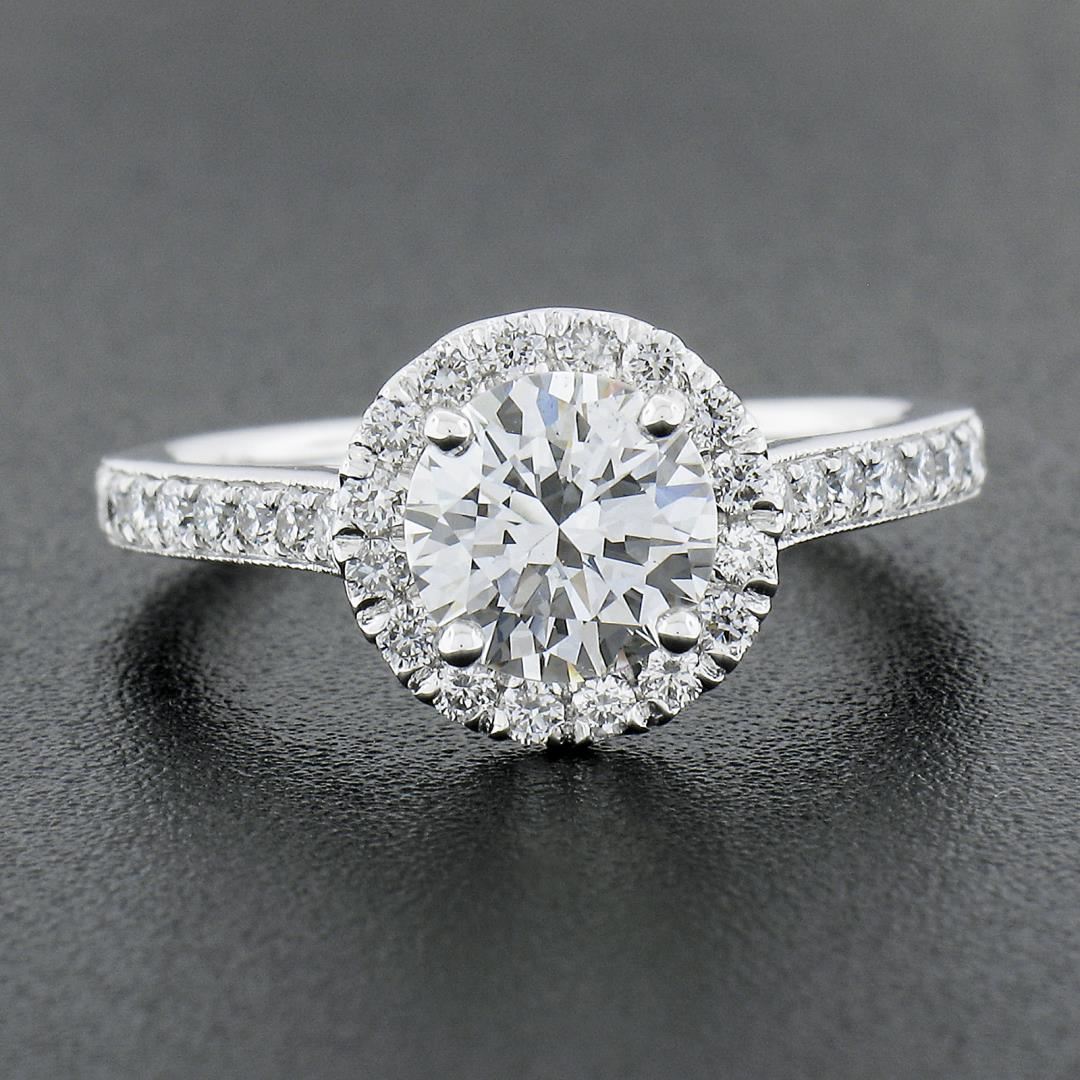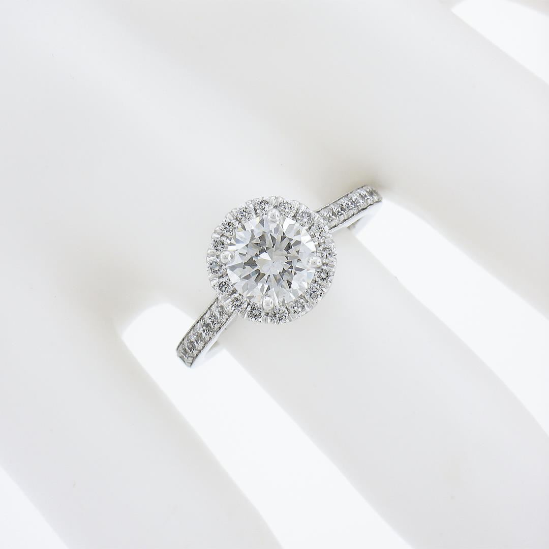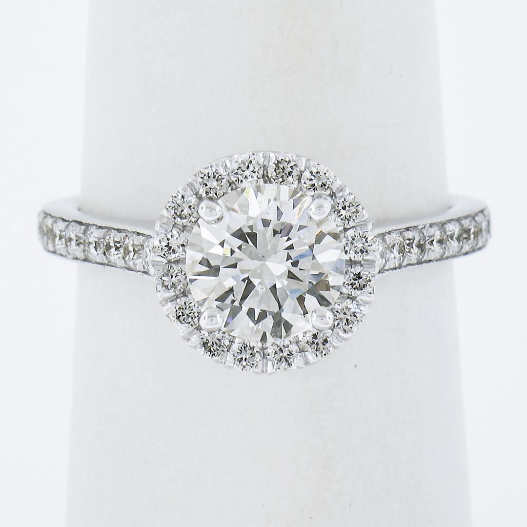 A new solid 14k white gold engagement ring, featuring 1 GIA round cut natrual diamond (F - SI1 ; 1.11ct ), with a halo of round cut natural diamonds (F/G - VS1/VS2 ; 0.48ctw). The ring is size 6.5, weighs a total of 3.20 grams, and measures 9.6mm wide. Comes with all original relevant certifications.