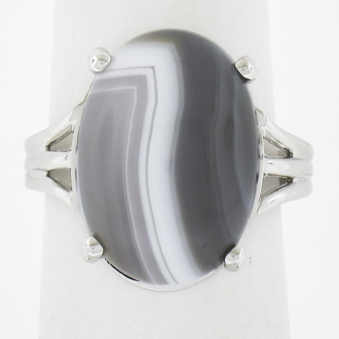 A new solid 14k white gold ring, with 1 oval cabochon cut natural agate (18.2x13mm). The ring is size 8.0, weighs a total of 5.31 grams, and measures 18.6mm wide.