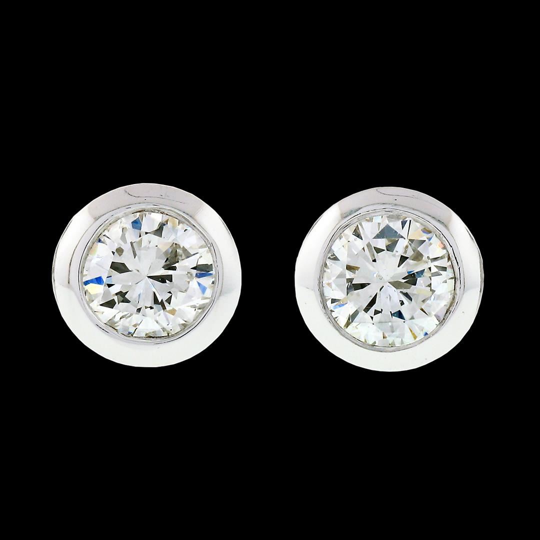 A new pair of solid 14k white gold stud earrings, with 2 round brilliant cut natural diamonds (G - VS2; 0.84ctw). The earrings measure approximately 7mm in diameter and weigh a total of 1.24 grams.