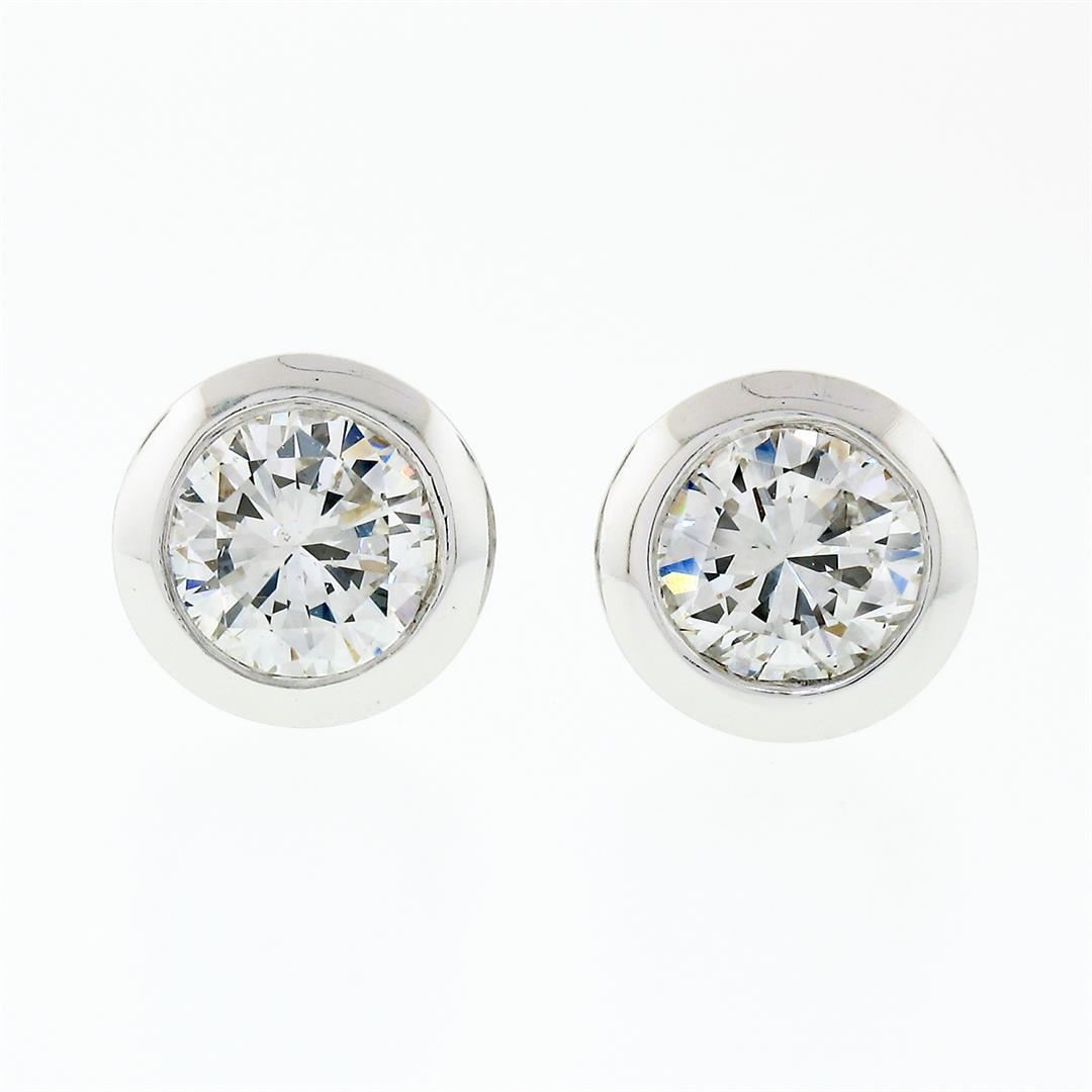 A new pair of solid 14k white gold stud earrings, with 2 round brilliant cut natural diamonds (G - VS2; 0.84ctw). The earrings measure approximately 7mm in diameter and weigh a total of 1.24 grams.