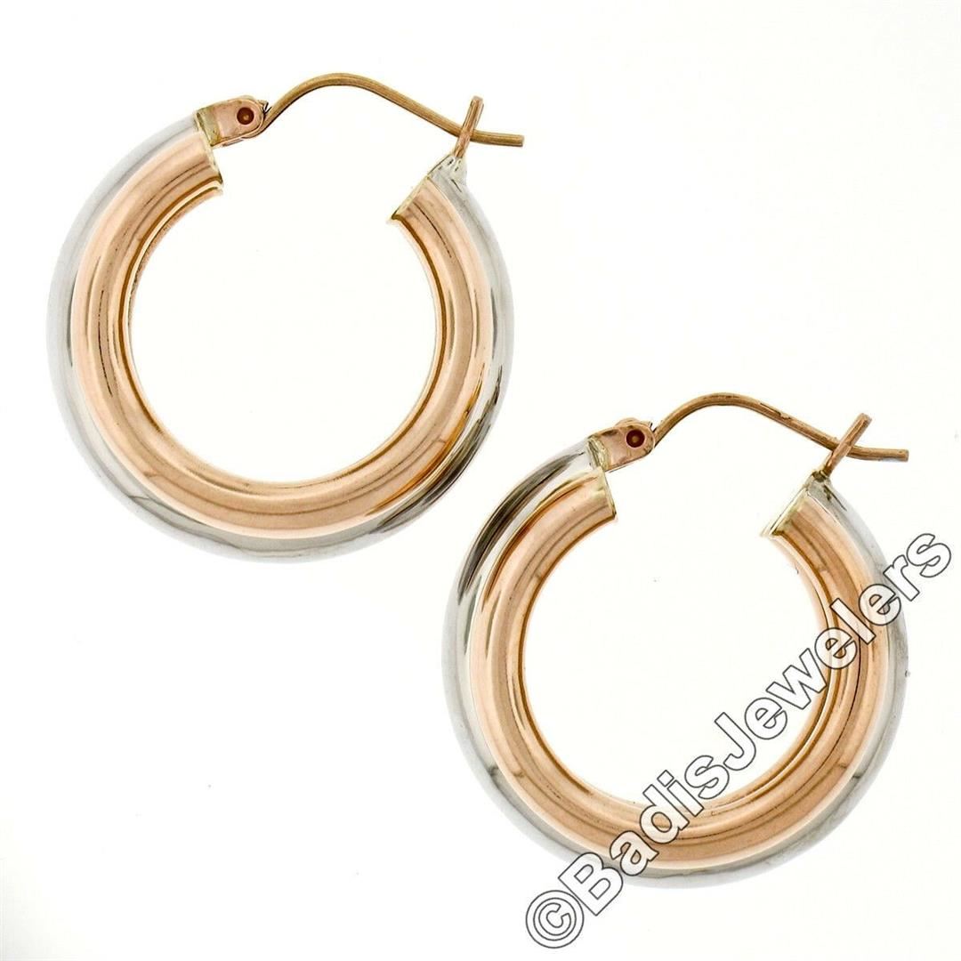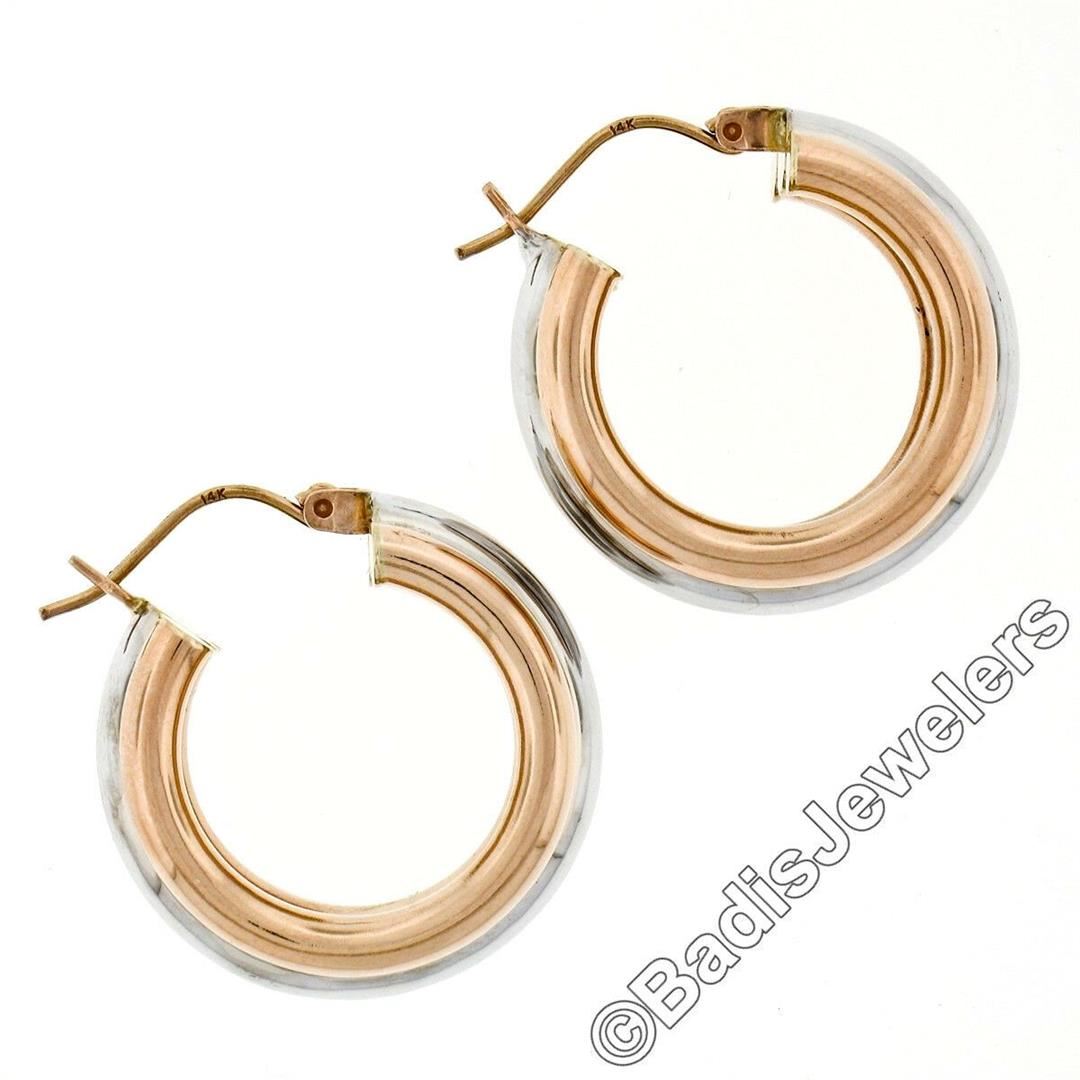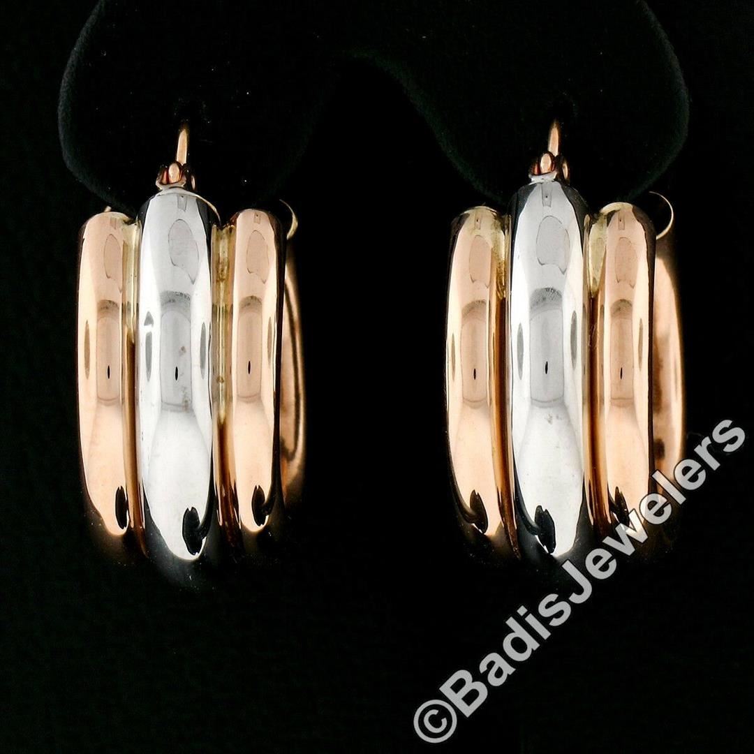 A new pair of 14kt white and rose gold hoop earrings featuring a puffed triple tube design. The earrings measure approximately 10.25mm wide, 22.65mm in diameter, and weigh a total of 6.00 grams.