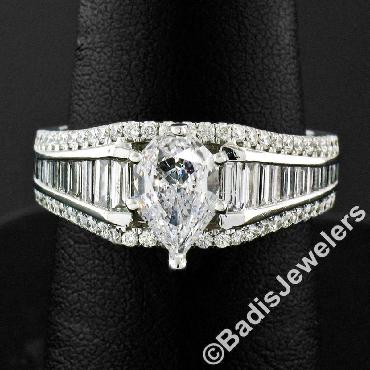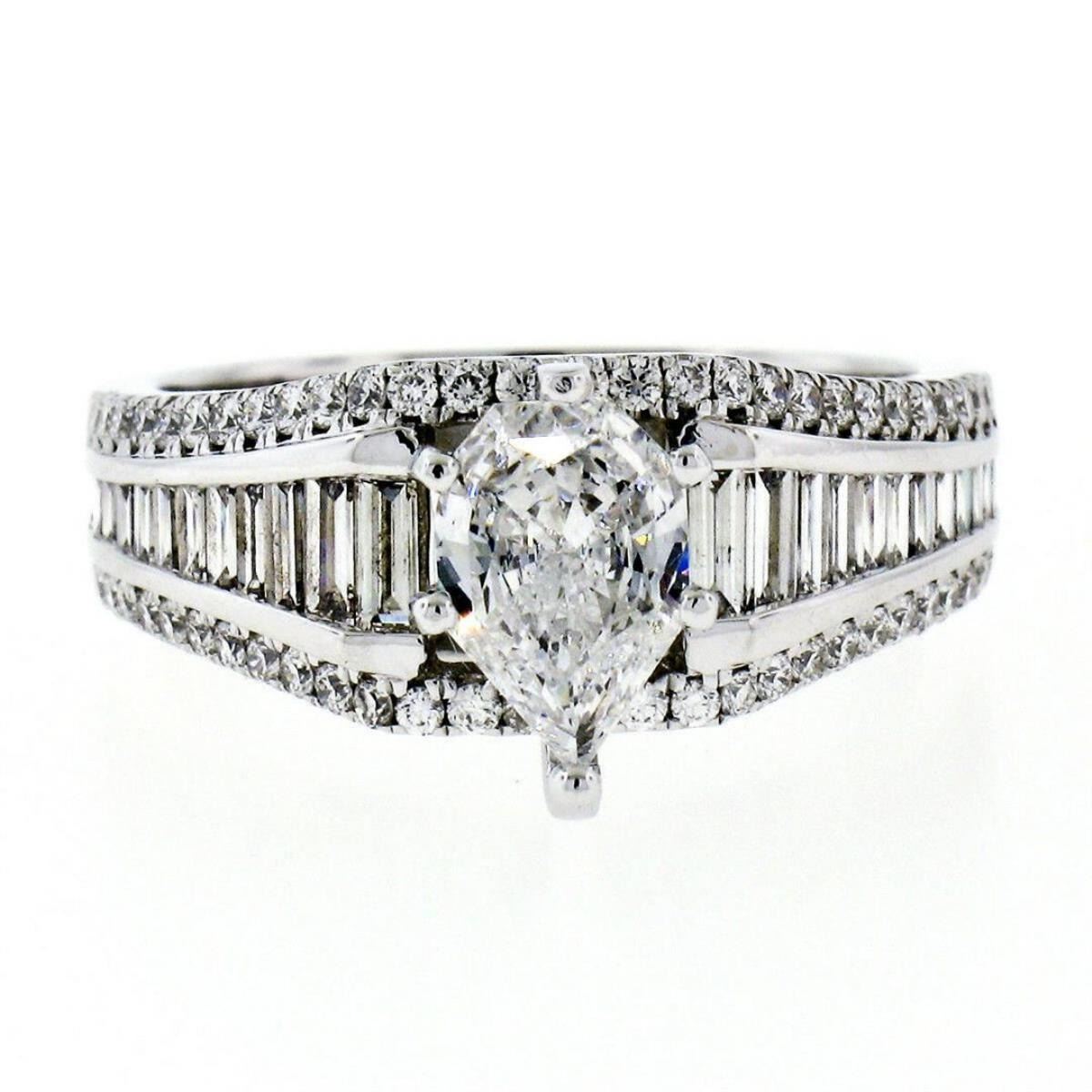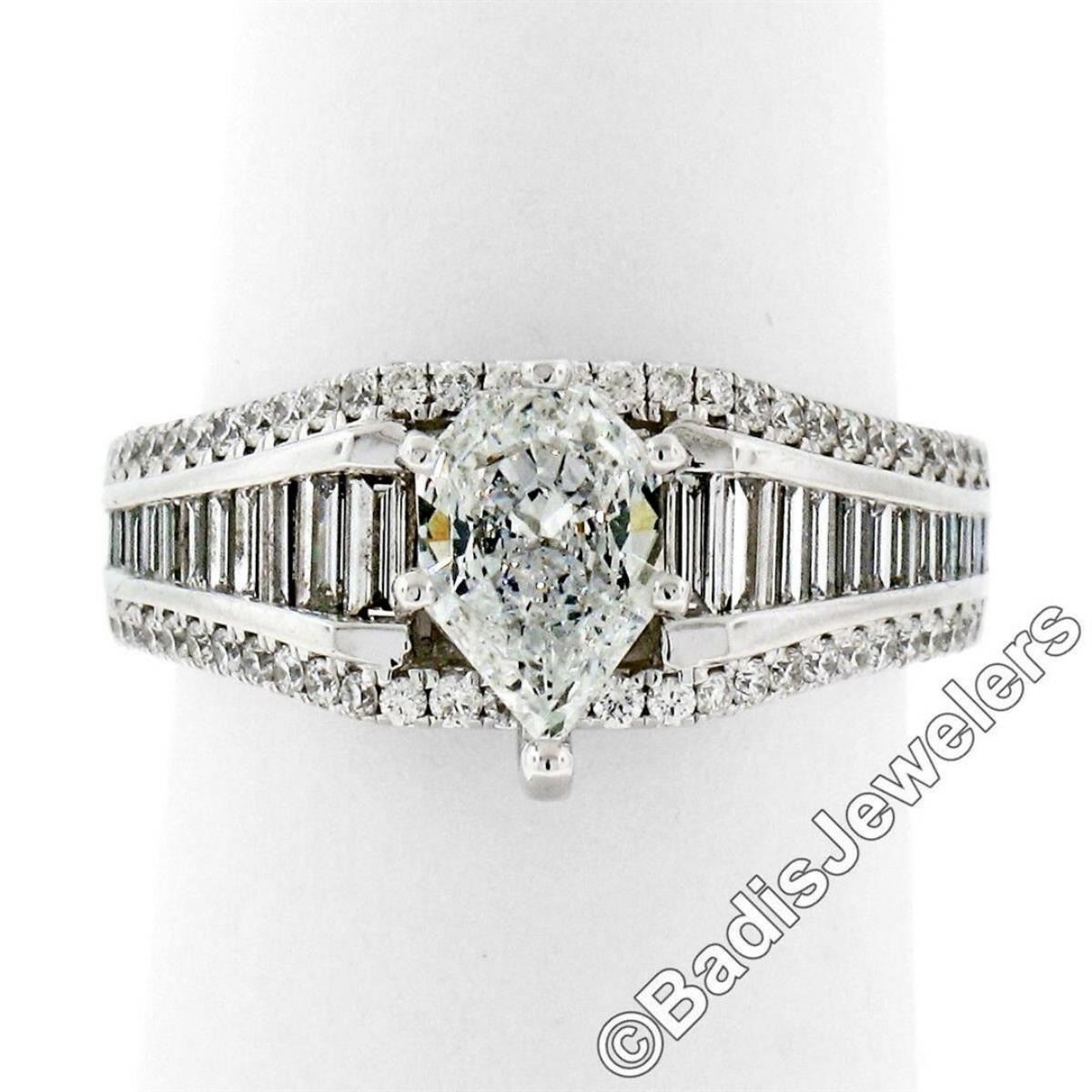 A new 14kt white gold engagement ring featuring a GIA certified 0.73ct pear cut diamond (D - I1) accented by 1.60ctw of baguette and round brilliant diamonds (F/G - VVS2/VS1). The ring is size 6.0, weighs a total of 5.15 grams, and measures 9.49mm wide. Comes with original GIA certification for the center stone.