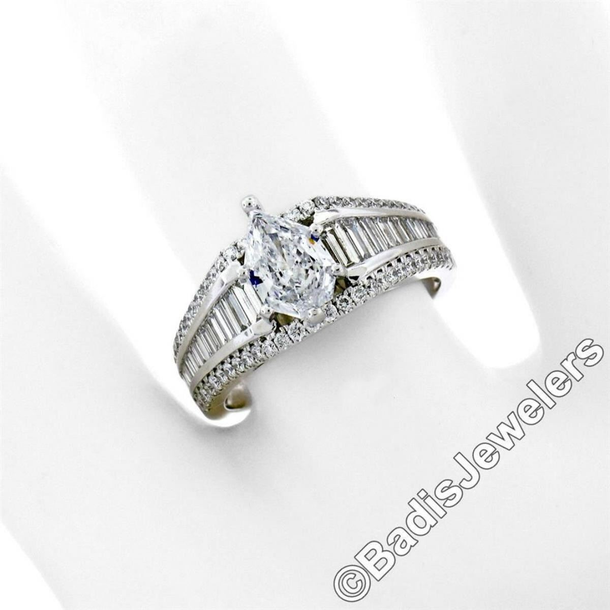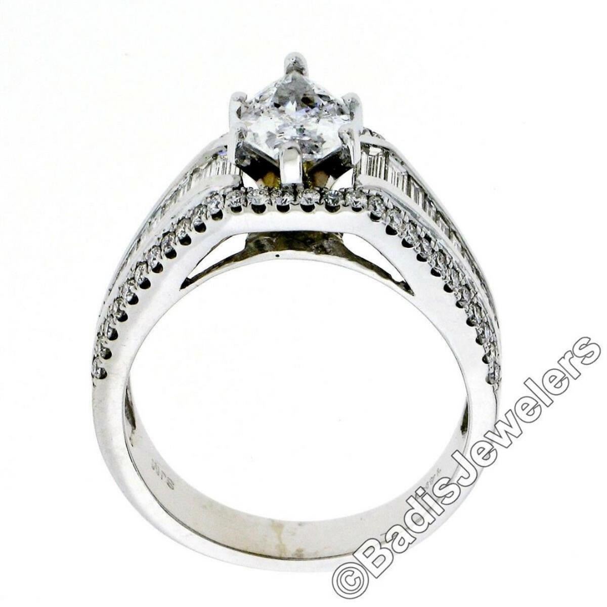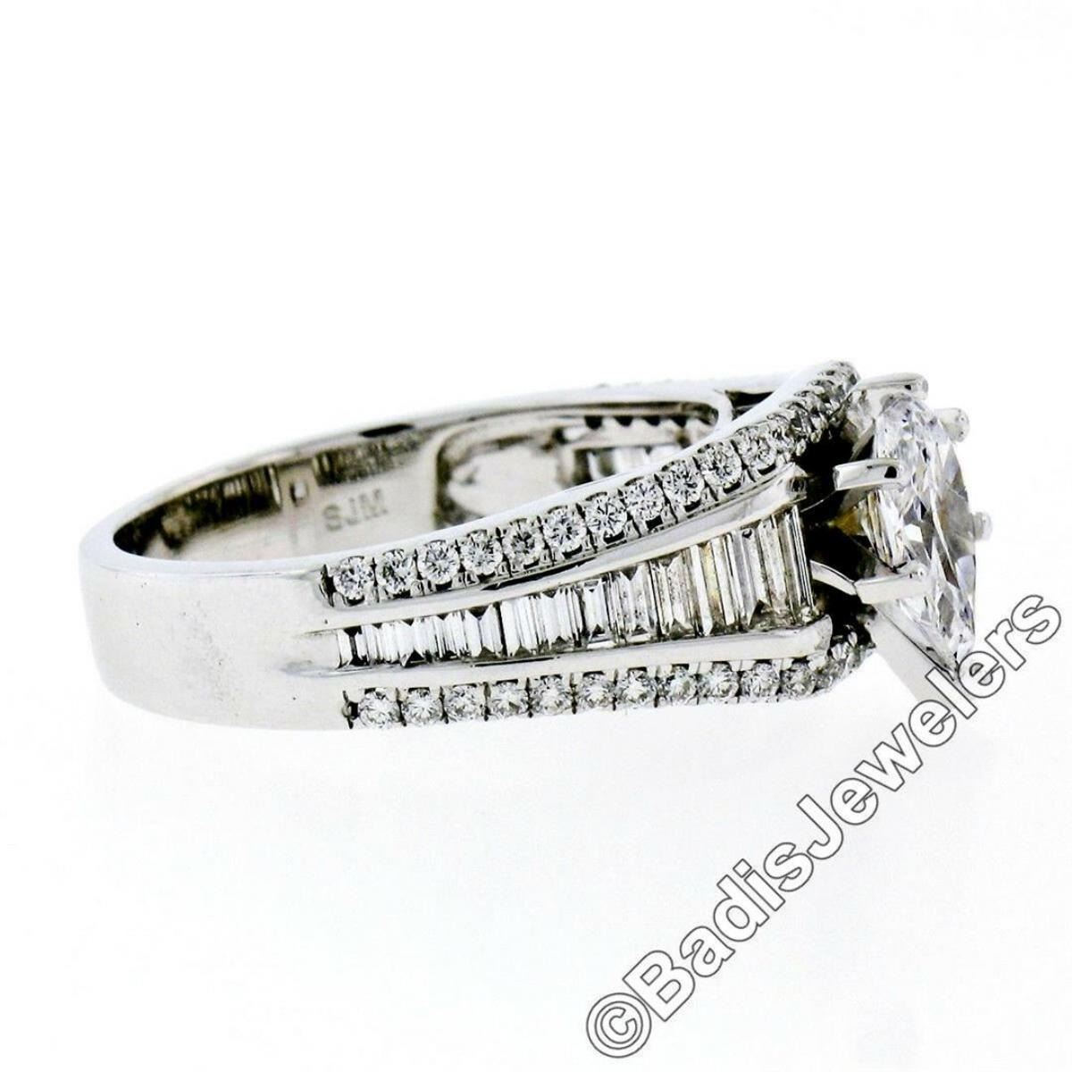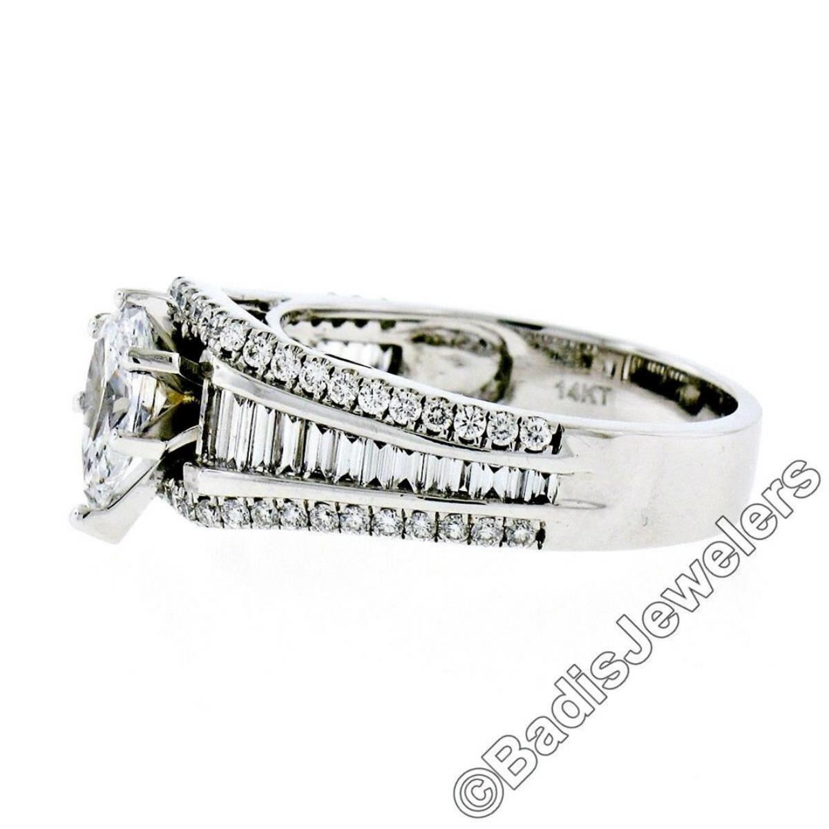 A new 14kt white gold engagement ring featuring a GIA certified 0.73ct pear cut diamond (D - I1) accented by 1.60ctw of baguette and round brilliant diamonds (F/G - VVS2/VS1). The ring is size 6.0, weighs a total of 5.15 grams, and measures 9.49mm wide. Comes with original GIA certification for the center stone.