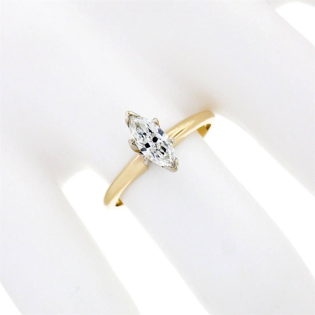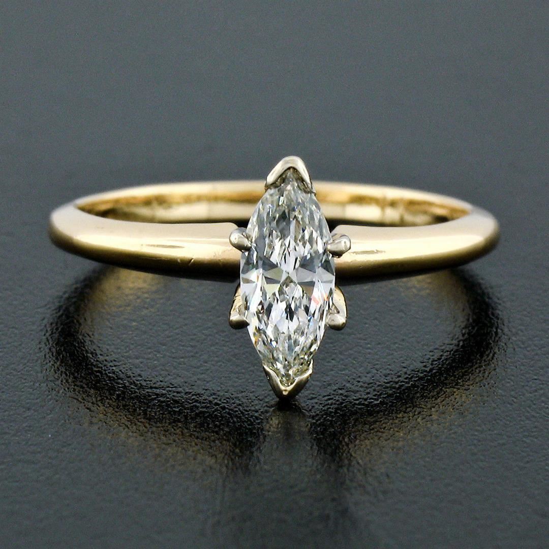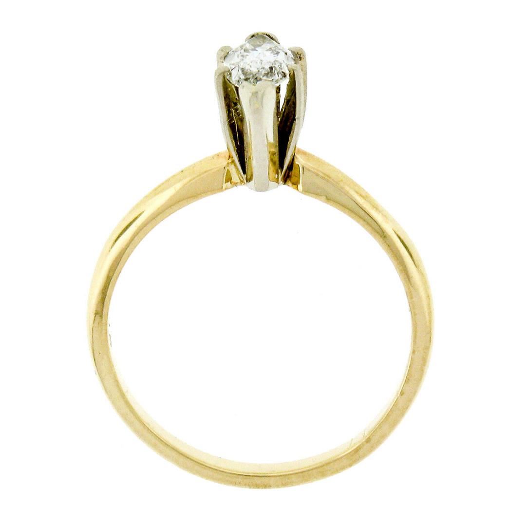 A 14kt yellow gold solitaire engagement ring featuring a 0.41ct marquise cut diamond (G/H - VS1) prong set in a 14kt white gold basket. The ring is size 6.0, weighs a total of 2.28 grams, and measures 9.85mm wide.