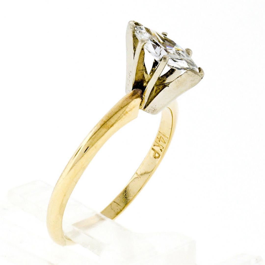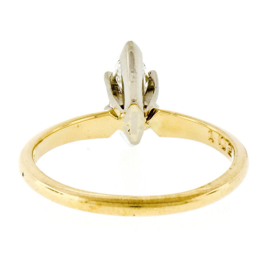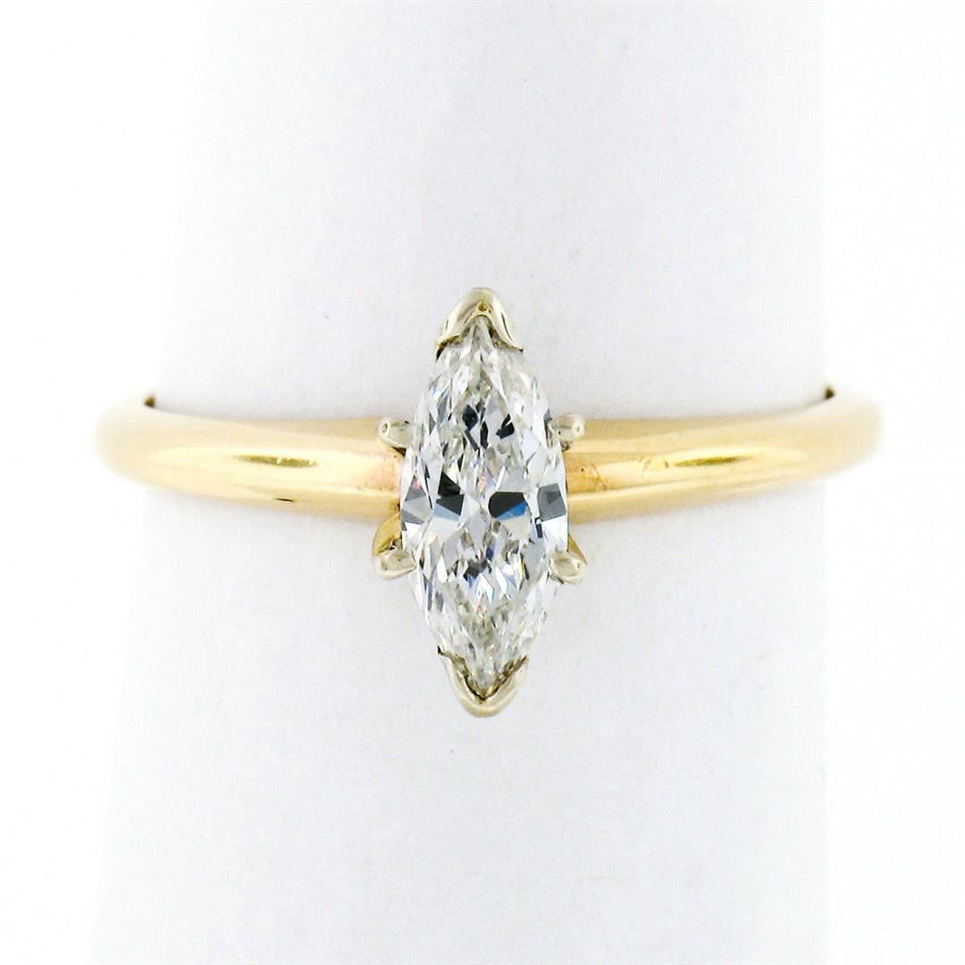 A 14kt yellow gold solitaire engagement ring featuring a 0.41ct marquise cut diamond (G/H - VS1) prong set in a 14kt white gold basket. The ring is size 6.0, weighs a total of 2.28 grams, and measures 9.85mm wide.