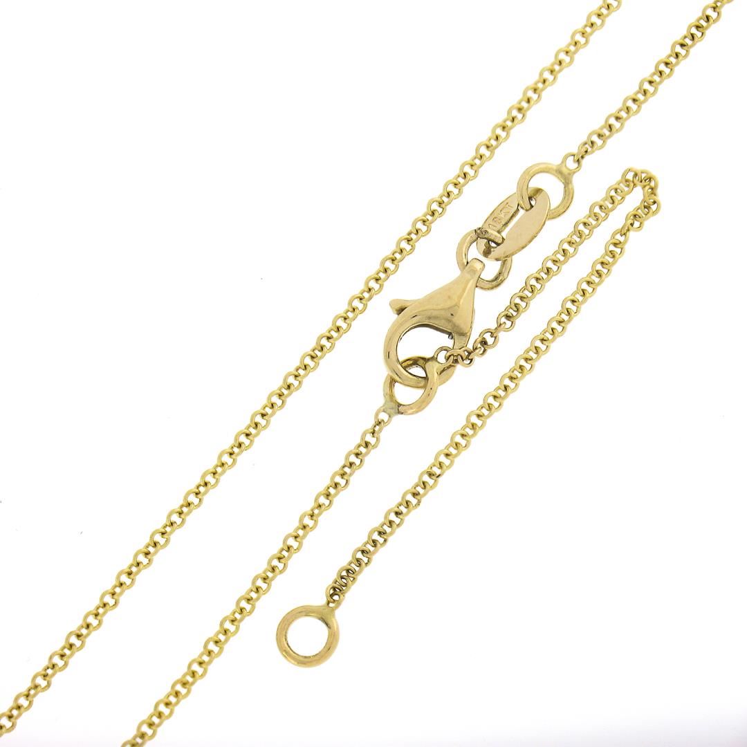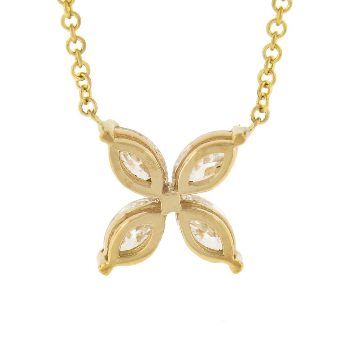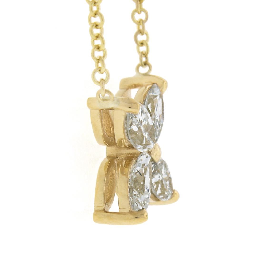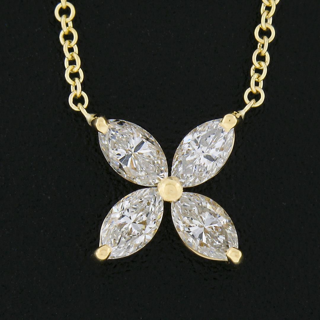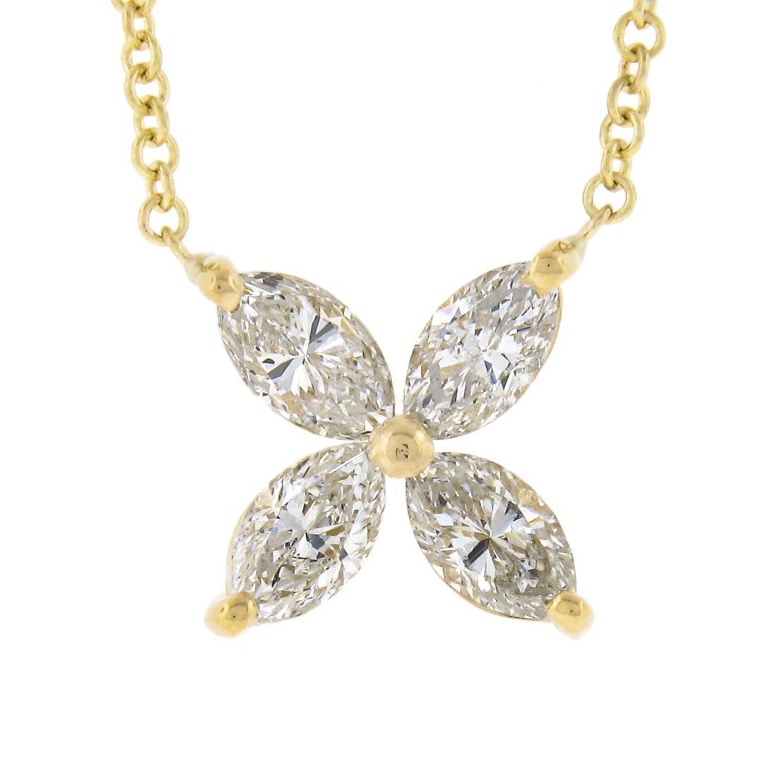 A new solid 18k yellow gold pendant necklace, with 4 marquise cut natural diamonds (H/I - VS2 w/ (1) SI2 ; 0.56ctw). Adjustable 16.5 and 18.5 inch cable link chain, 2.51 grams total weight, pendant measures 8.2x8.2mm.