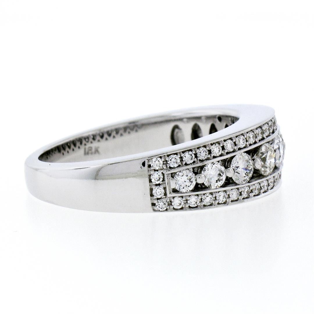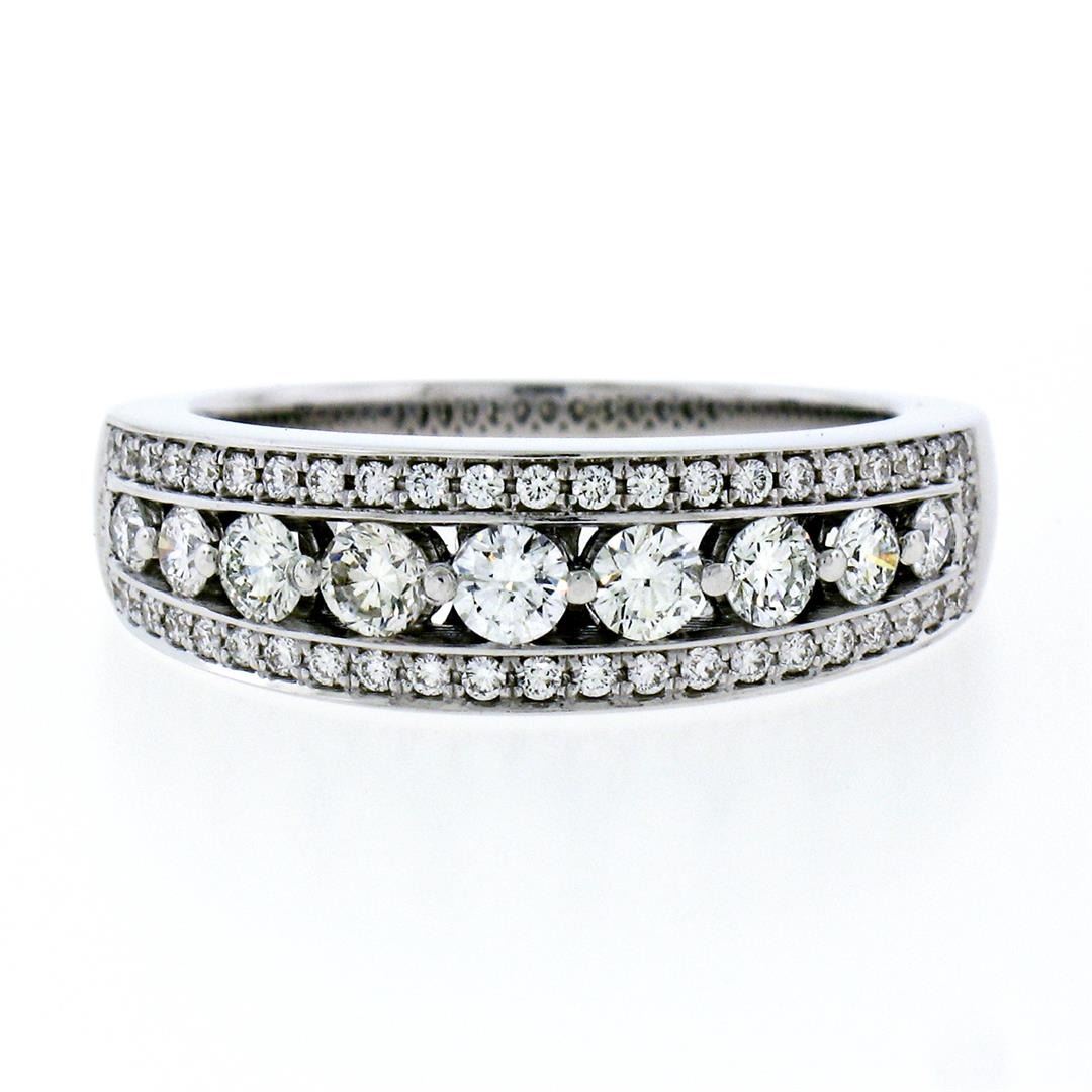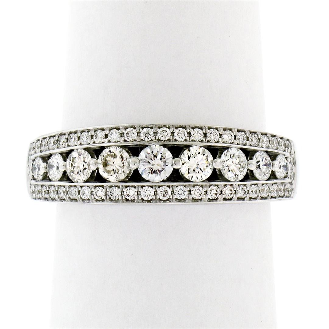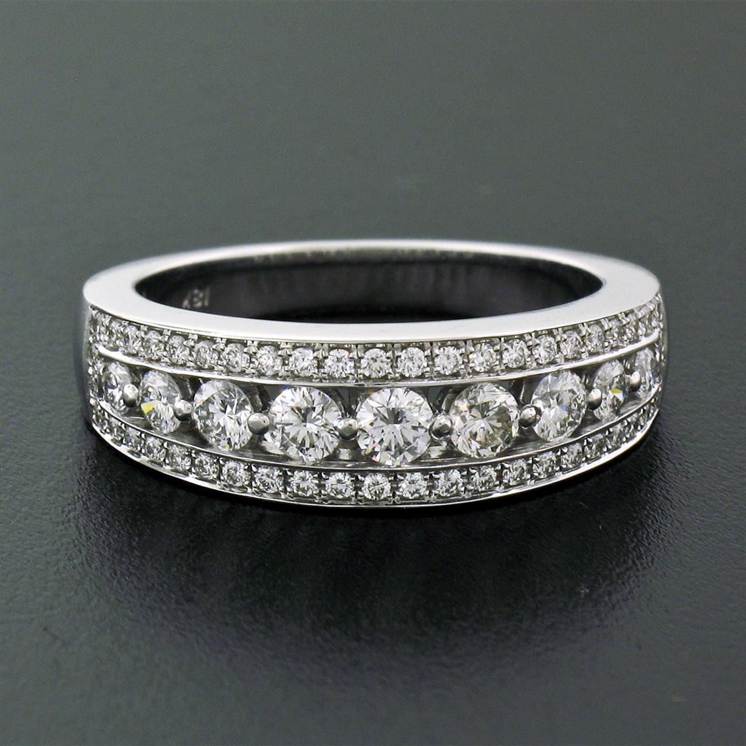 New 18k White Gold 1.0ctw Round Brilliant Pave & Shared Prong Diamond Band Ring. Please see photos and description for all available information. A new solid 18k white gold band ring, featuring 57 round brilliant cut natural diamonds (G/H- VS1; 1.00ctw). The ring is size 6.5, weighs a total of 6.74 grams, and measures 6.30mm wide.