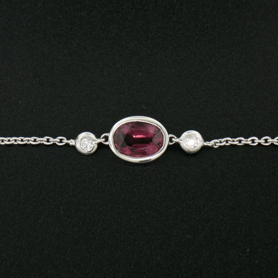 A new 18k white gold pendant necklace featuring a GIA certified 1.07ct oval pink sapphire accented by 2 round brilliant diamonds (G / VS1). 16 inch cable link chain, 4.48 grams total weight, measures 21.0x7.2mm.