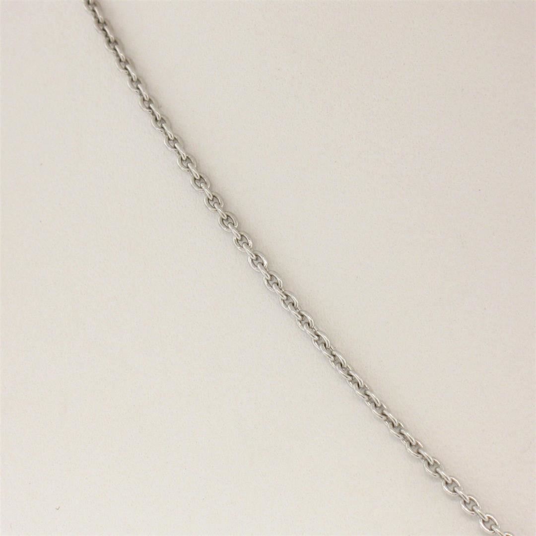 A new 18k white gold pendant necklace featuring a GIA certified 1.07ct oval pink sapphire accented by 2 round brilliant diamonds (G / VS1). 16 inch cable link chain, 4.48 grams total weight, measures 21.0x7.2mm.