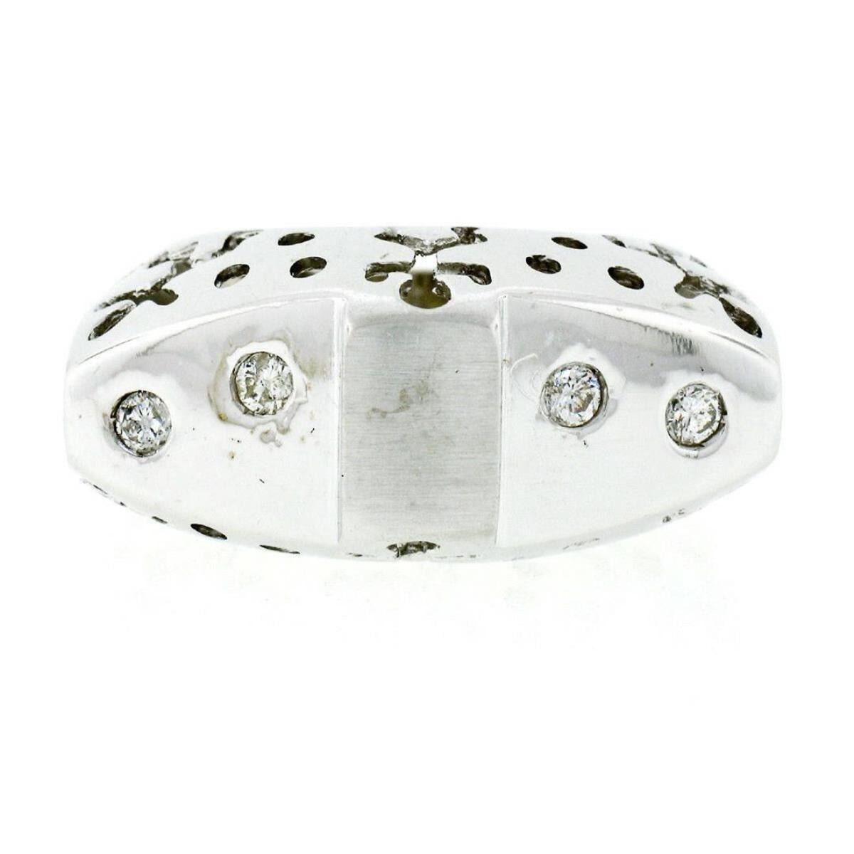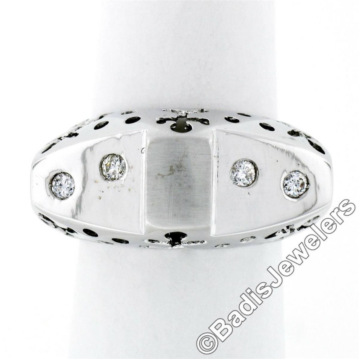 A new 18kt white gold band ring with pierced sides featuring 4 burnish set round brilliant diamonds (I - SI1; 0.16ctw). The ring is size 7.5, weighs a total of 9.30 grams, and measures 11.9mm wide.